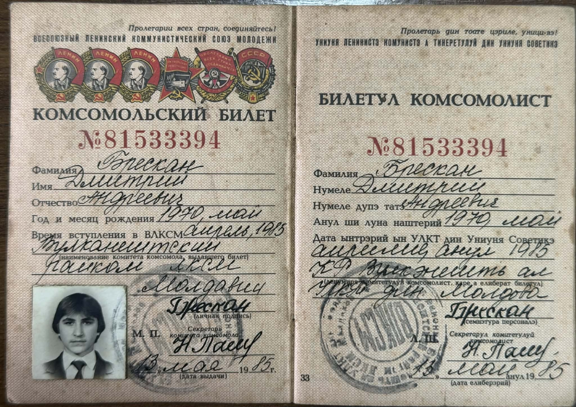 Documentul este un Bilet de Membru Comsomol (Uniunea Tineretului Comunist din fosta Uniune Sovietică), eliberat în anul 1985, pe numele lui Brescan Dumitru. Acesta este un document bilingv, scris în limbile rusă (partea stângă) și moldovenească/chirilică (partea dreaptă). Detaliile identificate în document se referă la: informațiile personale despre membru și detalii despre Aderare și Emitere.