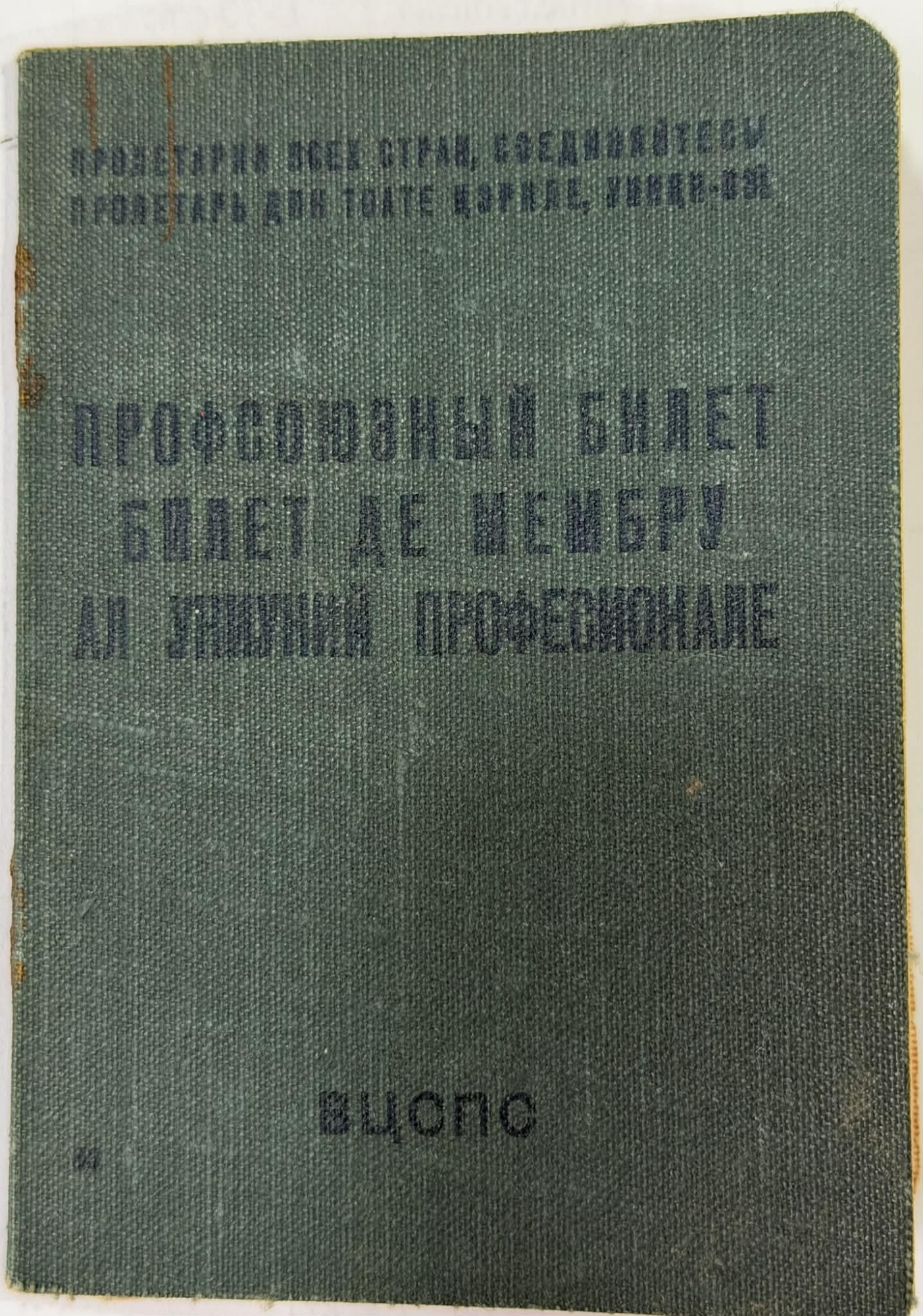 Document tip livret, pliat în două, având copertă de culoare verde și pagini interioare tipărite în limba rusă și limba moldovenească (scrisă cu alfabet chirilic). În partea stângă se regăsește titulatura «Профессиональные союзы СССР. Профсоюзный билет № 00348210» și efigia lui Lenin, element tipic pentru actele oficiale sovietice.