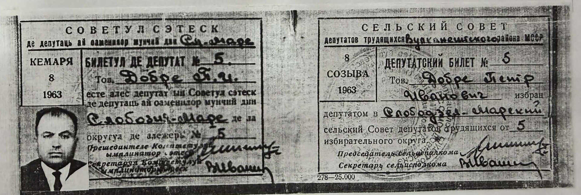 Documentul reprezintă Biletul de deputat (Dobre Petru) din fosta Republică Sovietică Socialistă Moldovenească (RSSM), prezentat sub formă de carnet pliabil.