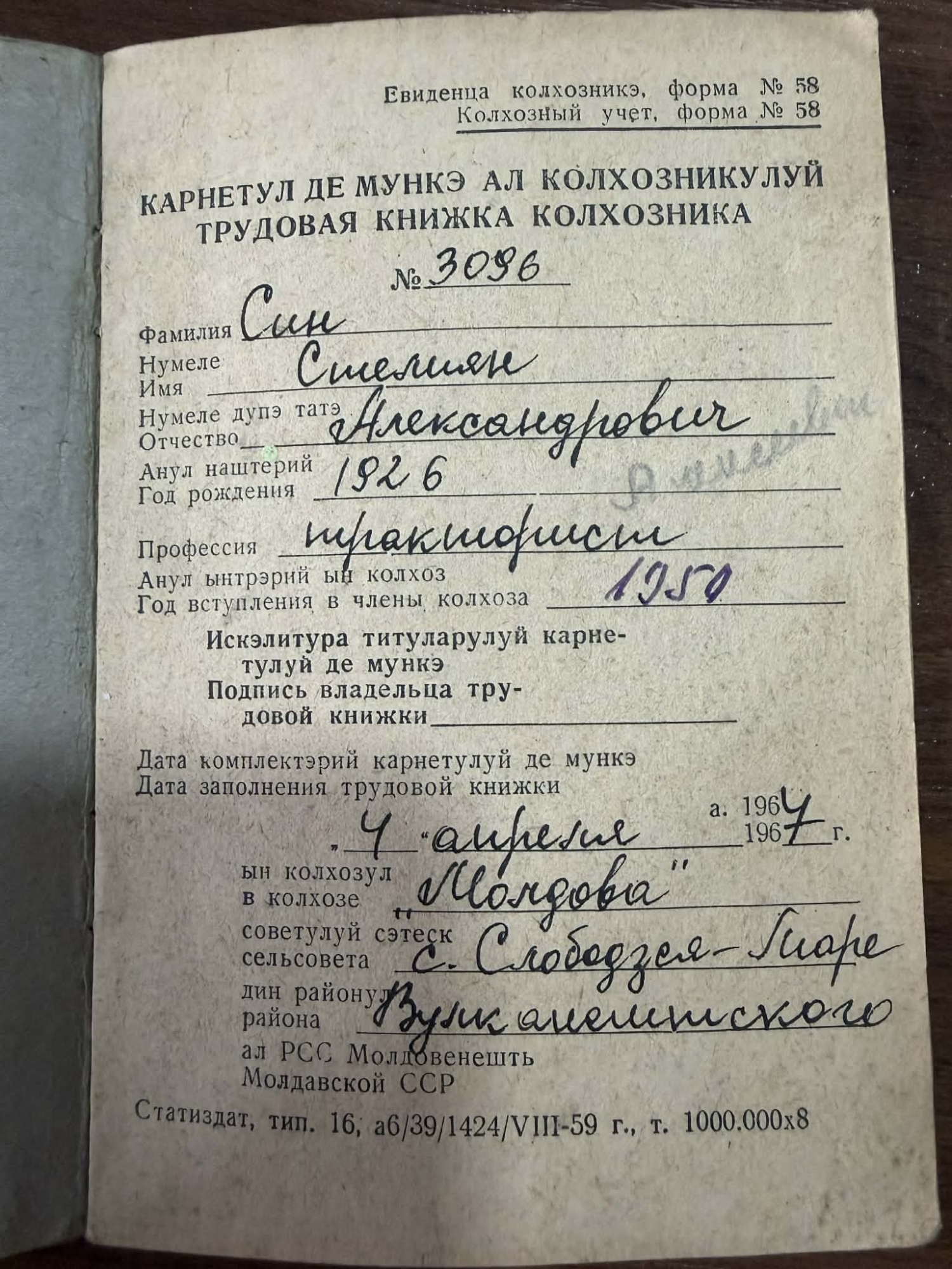 Carnetul este numerotat (nr. 3096) și conține datele titularului: numele (Sin), prenumele (Stelian) și patronimicul (Alexandru), anul nașterii (1926), profesia (tractorist), anul intrării în colhoz (1958). Data completării carnetului este menționată: 4 aprilie 1961.