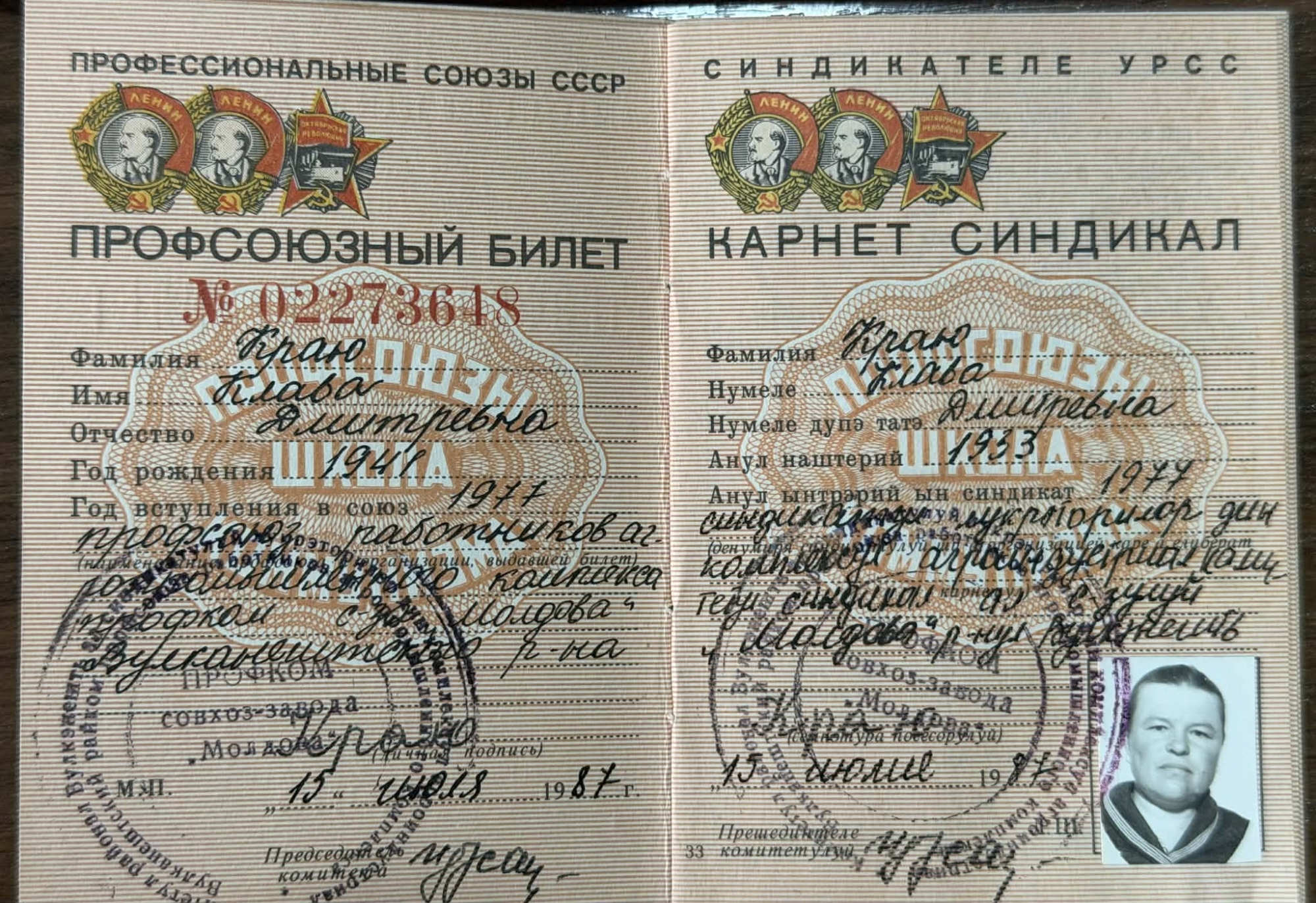 Document sub formă de carnet pliabil, tipărit în roșu, cu două coloane, una în limba rusă și una în limba moldovenească (chirilică). În partea superioară sunt ilustrate trei medalii/decorații Ordinul Lenin (Орден Ленина), indicând importanța Sindicatelor Profesionale din URSS (ПРОФЕССИОНАЛЬНЫЕ СОЮЗЫ СССР). Pe partea dreaptă este atașată o fotografie alb-negru a titularului- Craiu Clava . Acest carnet demonstrează că acesta a fost membru în sindicatul lucrătorilor din complexul agrosud, comitetul sindical al colhozului „Moldova”, raionul vulcănești, începând cu anul 1987.