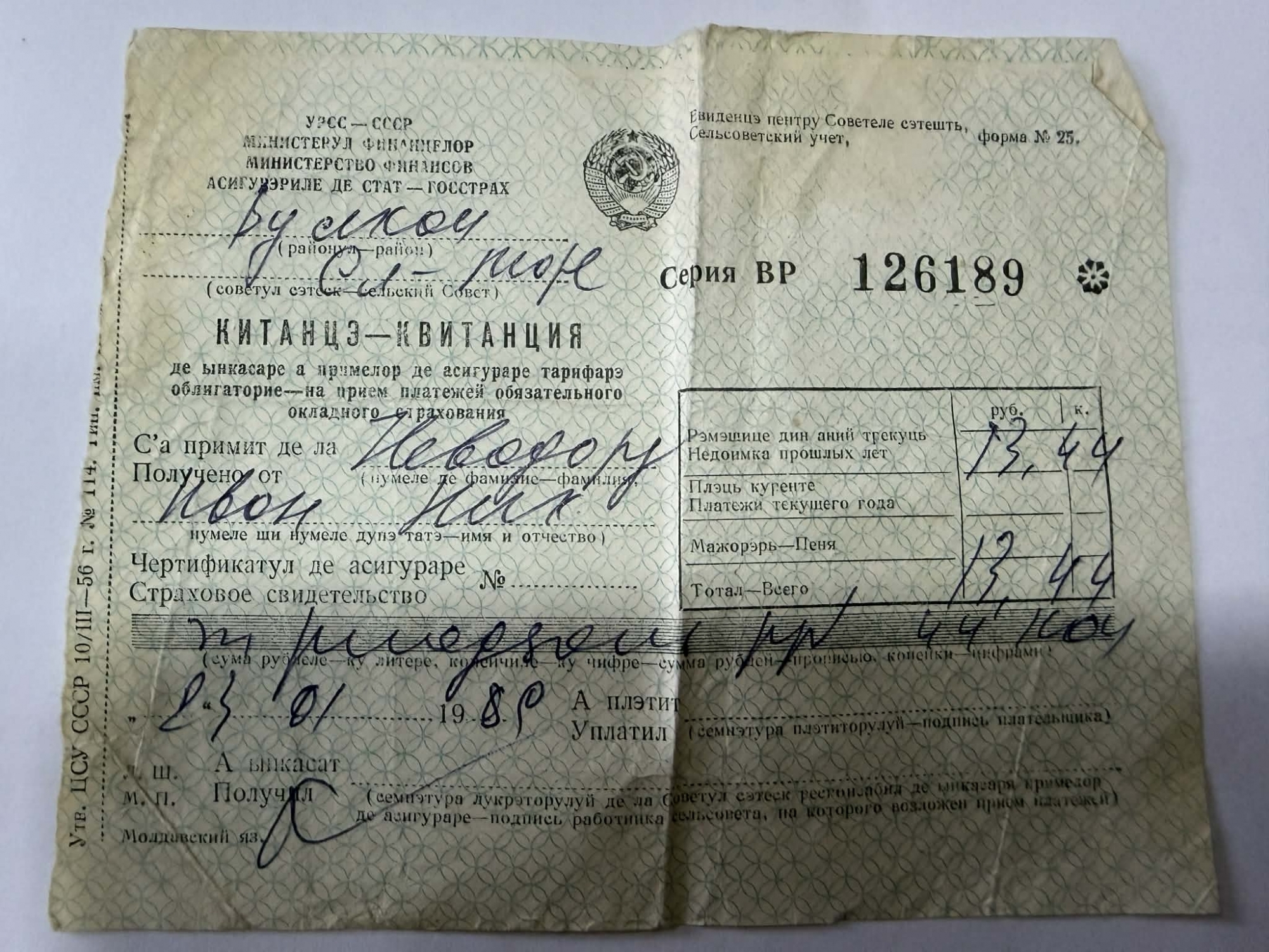 Documentul este tipărit pe formular standardizat, prevăzut cu antet oficial („СССР Министерство финансов Госстрах”), stema U.R.S.S., serie și număr unic. Include rubrici pentru completarea datelor plătitorului (nume, prenume- Nevodaru Ivan), numărul certificatului de asigurare-1459, precum și detalii privind suma achitată. Sunt menționate: restanțe din anii precedenți; plăți pentru anul curent; penalități; suma totală achitată (13 ruble 44 copeici). Documentul conține data achitării (1989) și rubrici pentru semnătura plătitorului și a funcționarului care a încasat suma. Chitanța servea drept dovadă a plății asigurării obligatorii de stat (locuință, bunuri, animale sau alte categorii supuse asigurării, conform legislației sovietice). Documentul era necesar pentru evidența fiscală și pentru eventuale despăgubiri. Piesa are valoare documentară și economică, ilustrând sistemul centralizat de asigurări din U.R.S.S. și mecanismele financiare aplicate populației rurale din RSS Moldovenească. Reflectă practica administrativă, tipologia formularelor oficiale și circulația monetară (rubla sovietică) în perioada anilor 1980.