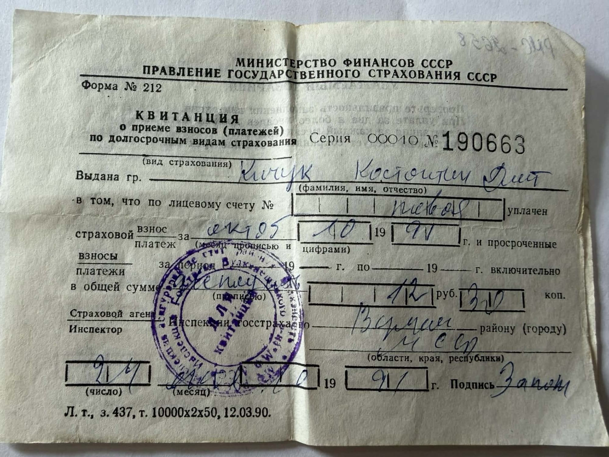 Document tipizat care confirmă primirea unei plăți aferente asigurărilor de stat pe termen lung. Chitanța atestă achitarea contribuțiilor pentru perioada octombrie 1991, pe numele Chiciuc Constantin, în sumă de 12 ruble 30 copeici (sumă înscrisă manuscris). Include numărul contului personal, perioada de referință, suma achitată și semnătura agentului/inspectorului de asigurări. Foaie tipizată, format dreptunghiular, tipărită pe hârtie subțire de culoare crem. Text tipografic în limba rusă, completări manuscrise cu cerneală albastră. Documentul prezintă pliere mediană, îngălbenire și ușoare cute la margini, specifice utilizării și păstrării îndelungate. Document cu valoare documentară, ilustrând funcționarea sistemului de asigurări de stat moștenit din perioada sovietică și utilizarea formularelor tipizate ale URSS în primii ani de după destrămarea acesteia. Reprezintă o mărturie a practicilor financiare și administrative ale anilor 1990 în spațiul post-sovietic.