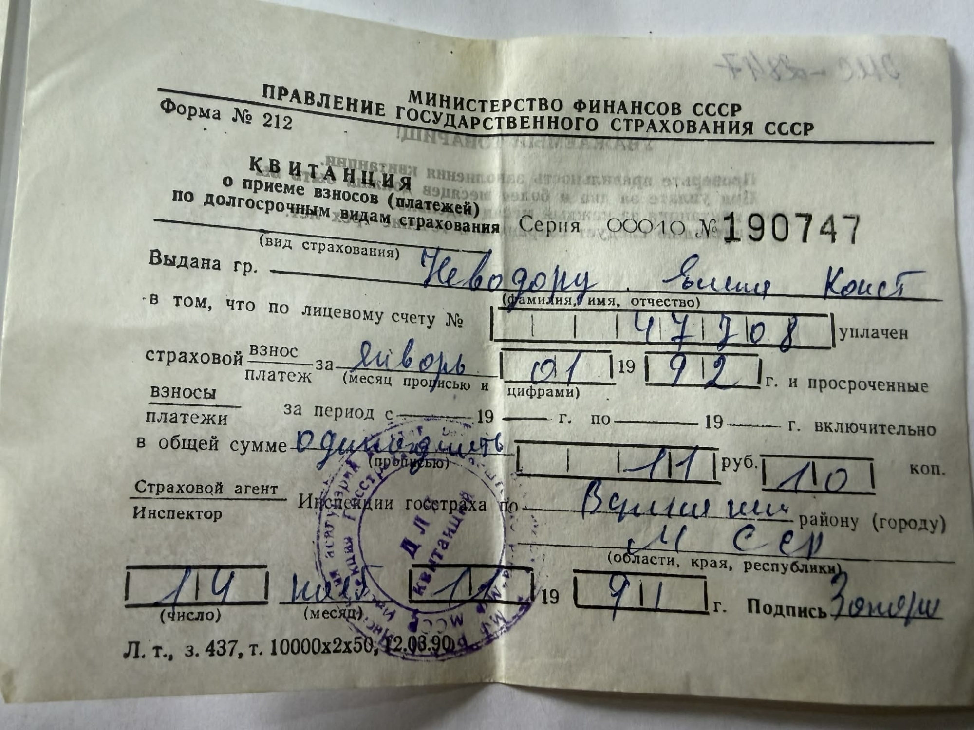 Document tipizat care confirmă primirea unei plăți aferente asigurărilor de stat pe termen lung. Chitanța atestă achitarea contribuțiilor pentru perioada ianuarie 1992, pe numele Nevodaru Elena, în sumă de 11 ruble 10 copeici (sumă înscrisă manuscris). Include numărul contului personal, perioada de referință, suma achitată și semnătura agentului/inspectorului de asigurări. Foaie tipizată, format dreptunghiular, tipărită pe hârtie subțire de culoare crem. Text tipografic în limba rusă, completări manuscrise cu cerneală albastră. Documentul prezintă pliere mediană, îngălbenire și ușoare cute la margini, specifice utilizării și păstrării îndelungate. Document cu valoare documentară, ilustrând funcționarea sistemului de asigurări de stat moștenit din perioada sovietică și utilizarea formularelor tipizate ale URSS în primii ani de după destrămarea acesteia. Reprezintă o mărturie a practicilor financiare și administrative ale anilor 1990 în spațiul post-sovietic.