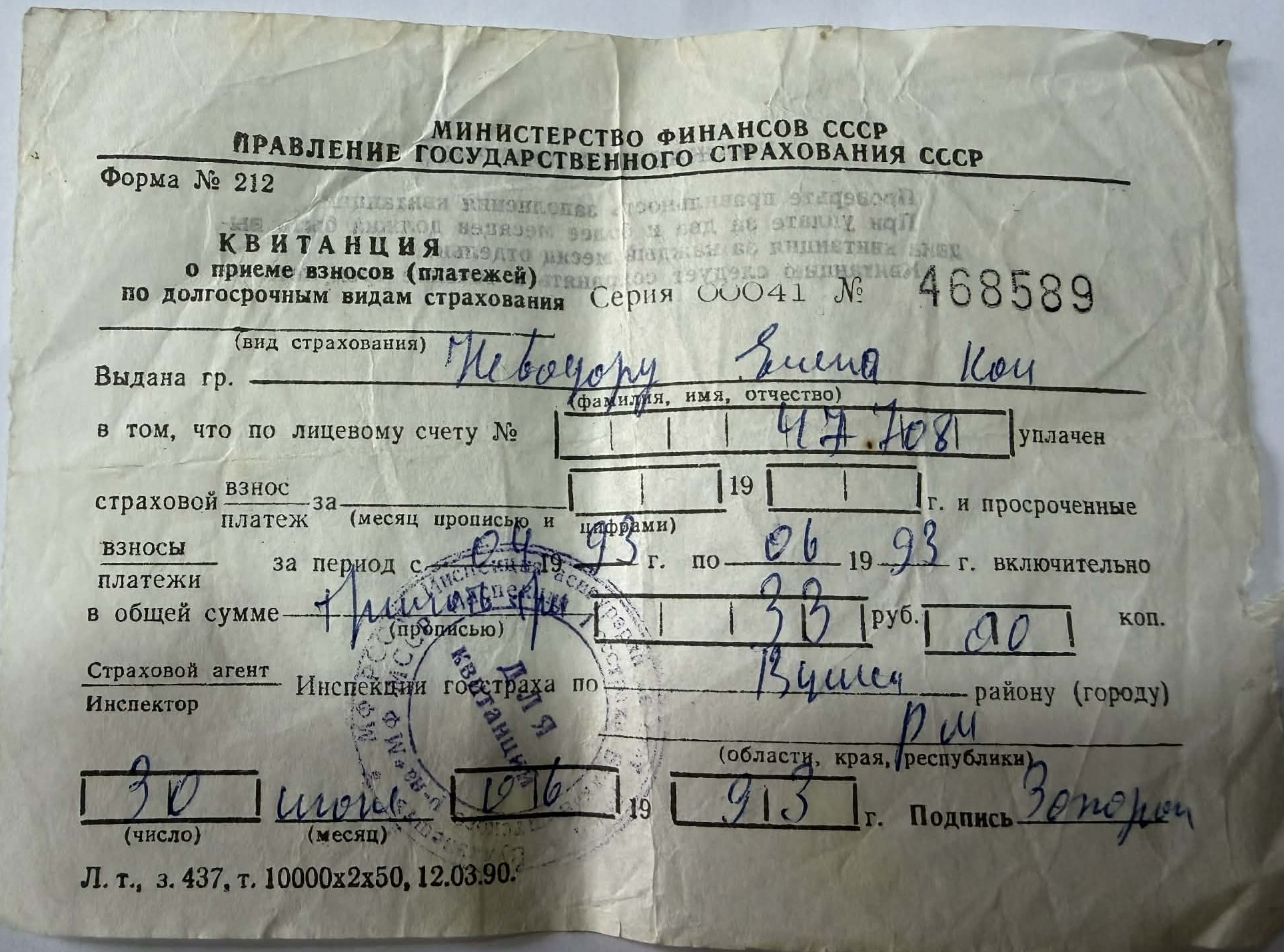 Document tipizat care confirmă primirea unei plăți aferente asigurărilor de stat pe termen lung. Chitanța atestă achitarea contribuțiilor pentru perioada aprilie 1993– iunie 1993, pe numele Nevodaru Elena, în sumă de 33 ruble (sumă înscrisă manuscris). Include numărul contului personal, perioada de referință, suma achitată și semnătura agentului/inspectorului de asigurări. Foaie tipizată, format dreptunghiular, tipărită pe hârtie subțire de culoare crem. Text tipografic în limba rusă, completări manuscrise cu cerneală albastră. Documentul prezintă pliere mediană, îngălbenire și ușoare cute la margini, specifice utilizării și păstrării îndelungate. Document cu valoare documentară, ilustrând funcționarea sistemului de asigurări de stat moștenit din perioada sovietică și utilizarea formularelor tipizate ale URSS în primii ani de după destrămarea acesteia. Reprezintă o mărturie a practicilor financiare și administrative ale anilor 1990 în spațiul post-sovietic.