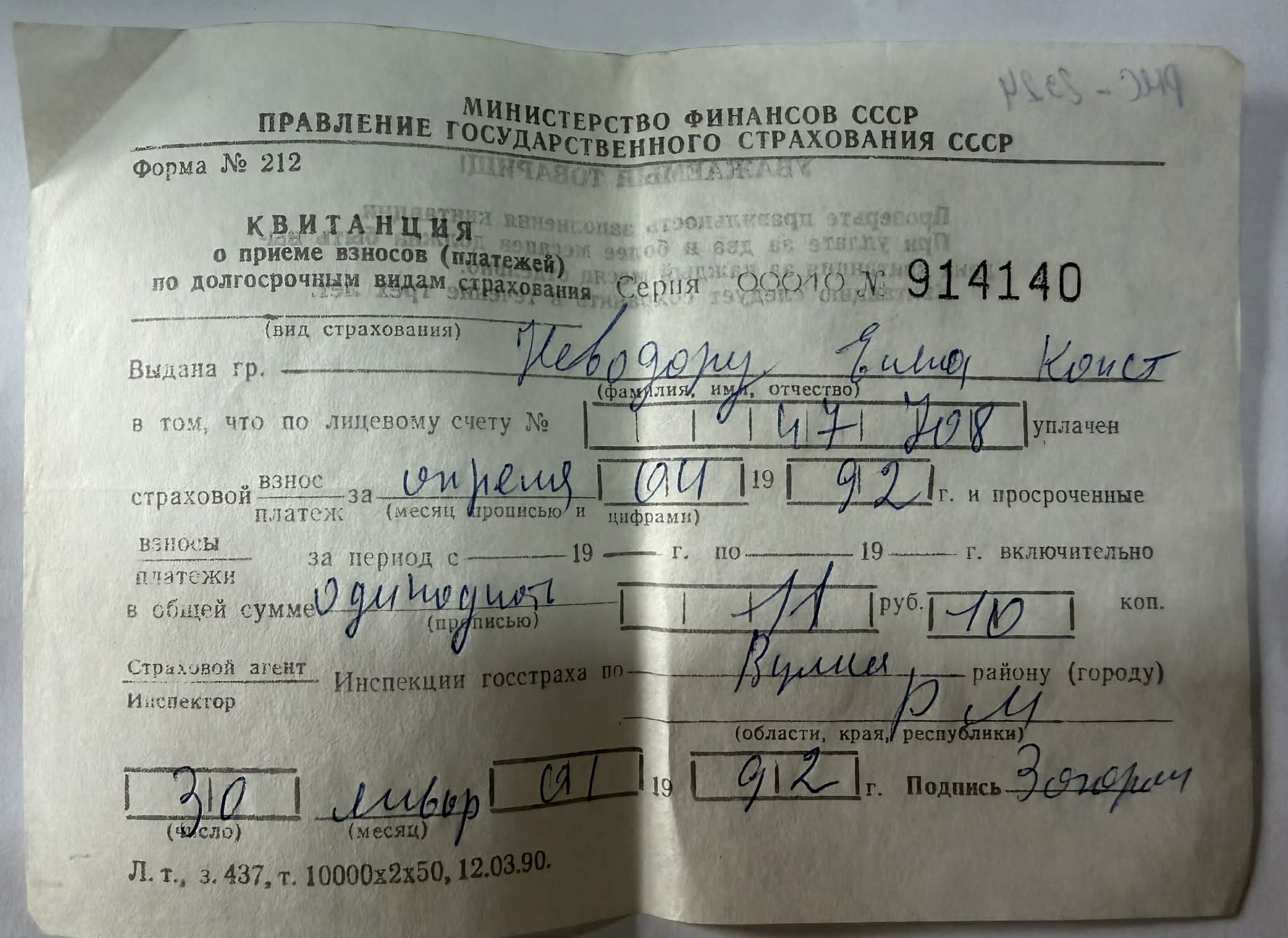 Document cu valoare documentară, ilustrând funcționarea sistemului de asigurări de stat moștenit din perioada sovietică și utilizarea formularelor tipizate ale URSS în primii ani de după destrămarea acesteia. Reprezintă o mărturie a practicilor financiare și administrative ale anilor 1990 în spațiul post-sovietic.