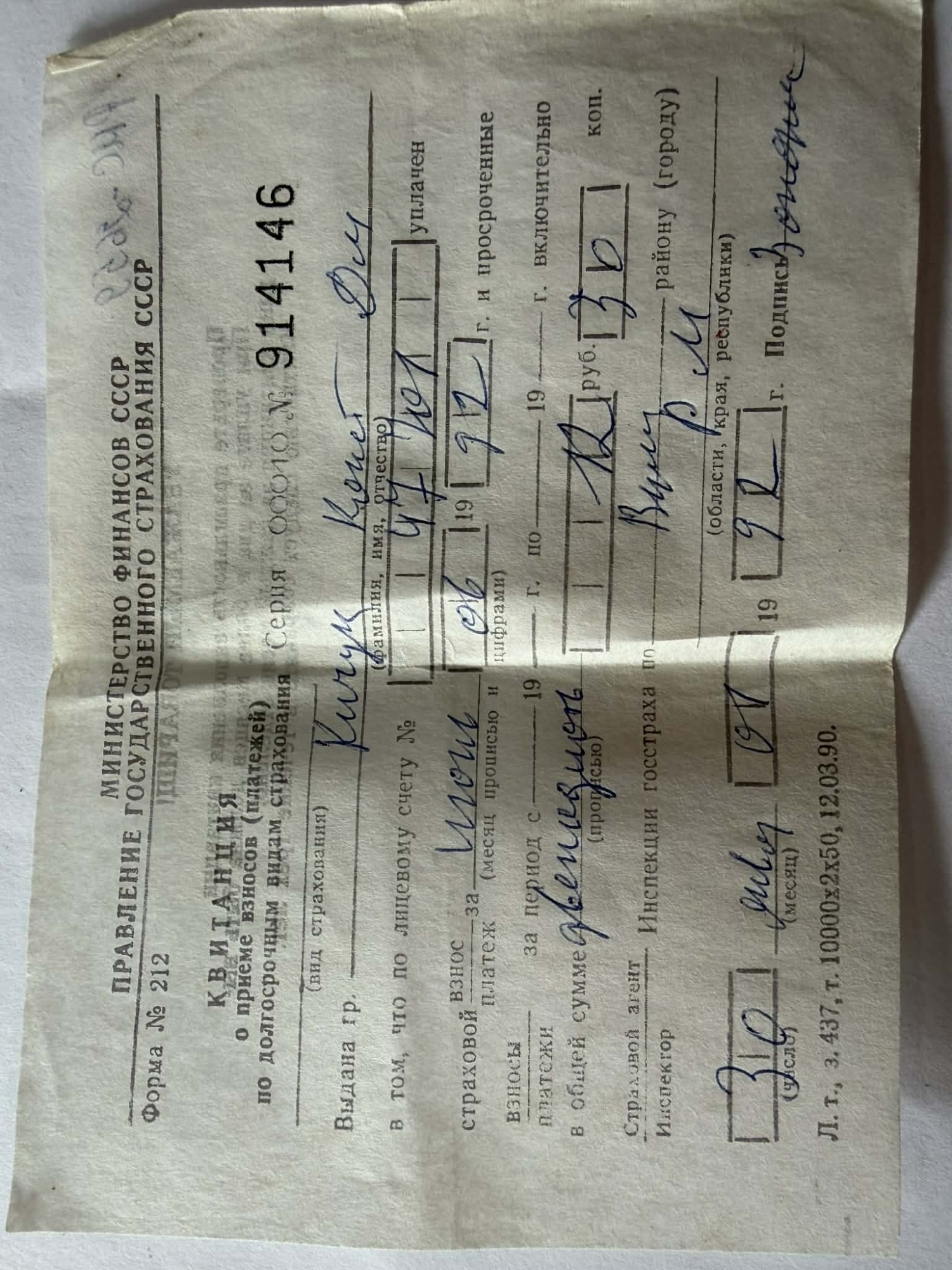 Document cu valoare documentară, ilustrând funcționarea sistemului de asigurări de stat moștenit din perioada sovietică și utilizarea formularelor tipizate ale URSS în primii ani de după destrămarea acesteia. Reprezintă o mărturie a practicilor financiare și administrative ale anilor 1990 în spațiul post-sovietic.