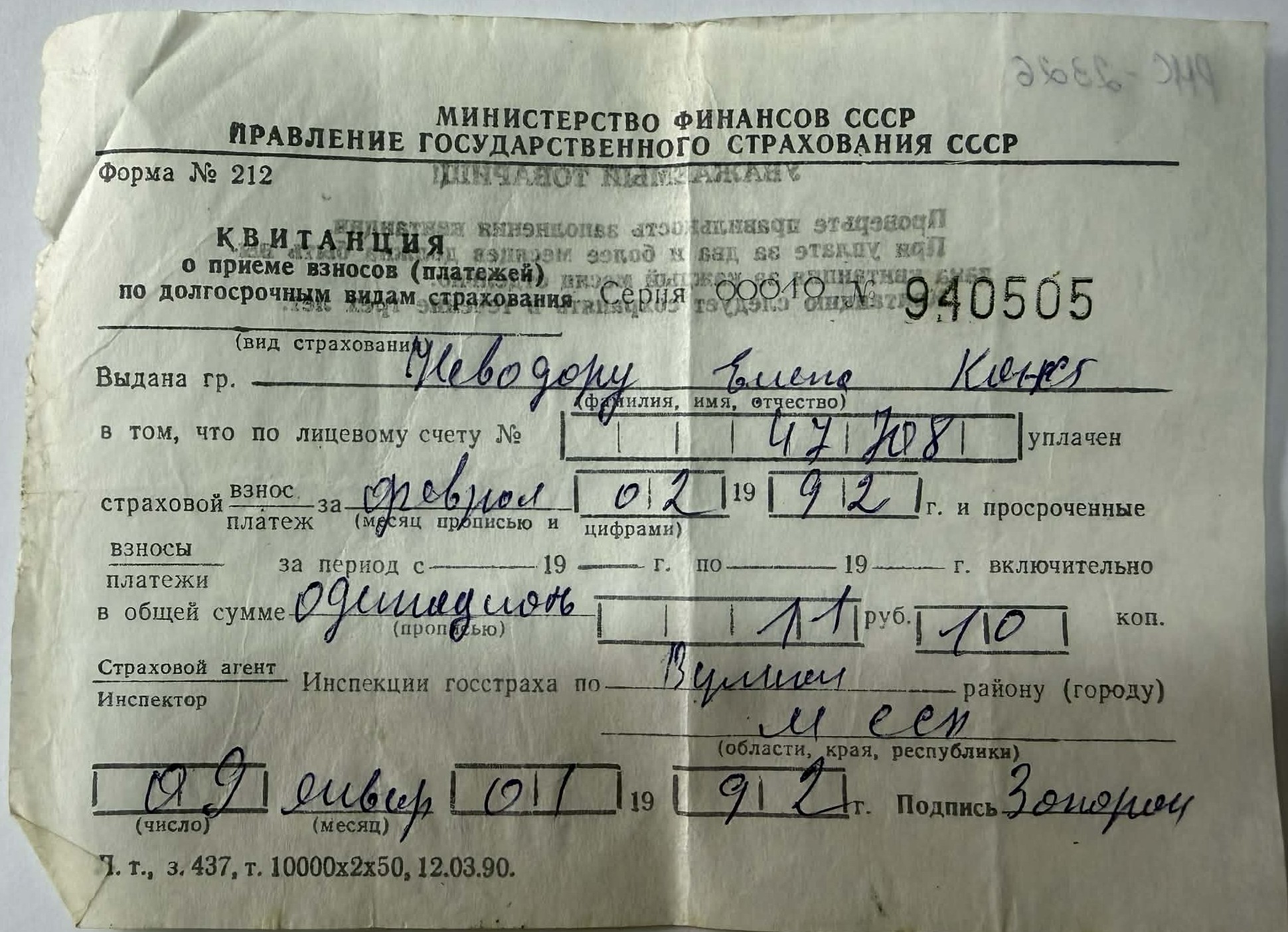 Document tipizat care confirmă primirea unei plăți aferente asigurărilor de stat pe termen lung. Chitanța atestă achitarea contribuțiilor pentru perioada februarie 1992, pe numele Nevodaru Elena, în sumă de 11 ruble 10 copeici (sumă înscrisă manuscris). Include numărul contului personal, perioada de referință, suma achitată și semnătura agentului/inspectorului de asigurări. Foaie tipizată, format dreptunghiular, tipărită pe hârtie subțire de culoare crem. Text tipografic în limba rusă, completări manuscrise cu cerneală albastră. Documentul prezintă pliere mediană, îngălbenire și ușoare cute la margini, specifice utilizării și păstrării îndelungate. Document cu valoare documentară, ilustrând funcționarea sistemului de asigurări de stat moștenit din perioada sovietică și utilizarea formularelor tipizate ale URSS în primii ani de după destrămarea acesteia. Reprezintă o mărturie a practicilor financiare și administrative ale anilor 1990 în spațiul post-sovietic.