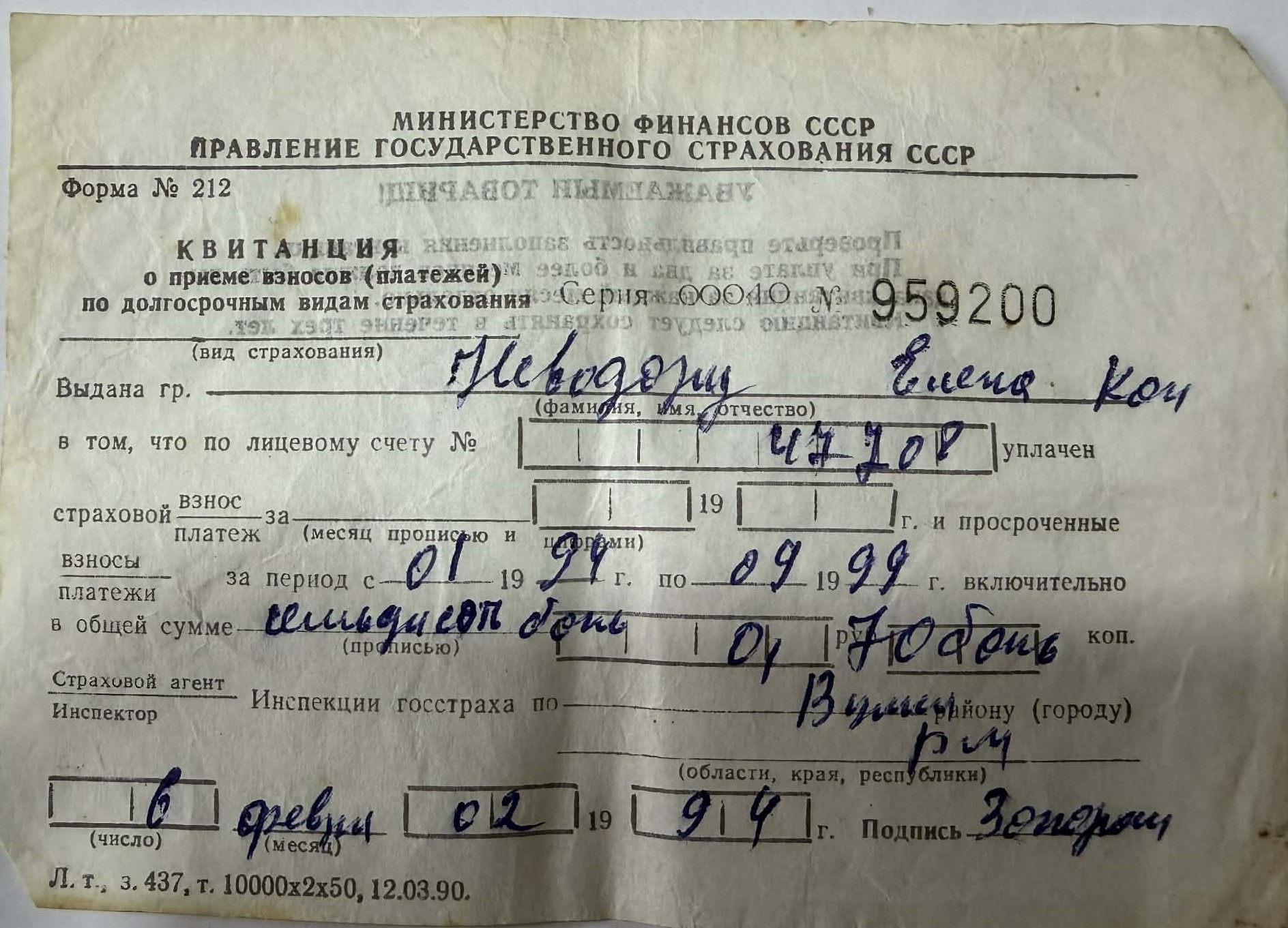 Document tipizat care confirmă primirea unei plăți aferente asigurărilor de stat pe termen lung. Chitanța atestă achitarea contribuțiilor pentru perioada ianuarie 1994 – septembrie 1999, pe numele Nevodaru Elena, în sumă de 70 ruble (sumă înscrisă manuscris). Include numărul contului personal, perioada de referință, suma achitată și semnătura agentului/inspectorului de asigurări. Foaie tipizată, format dreptunghiular, tipărită pe hârtie subțire de culoare crem. Text tipografic în limba rusă, completări manuscrise cu cerneală albastră. Documentul prezintă pliere mediană, îngălbenire și ușoare cute la margini, specifice utilizării și păstrării îndelungate. Document cu valoare documentară, ilustrând funcționarea sistemului de asigurări de stat moștenit din perioada sovietică și utilizarea formularelor tipizate ale URSS în primii ani de după destrămarea acesteia. Reprezintă o mărturie a practicilor financiare și administrative ale anilor 1990 în spațiul post-sovietic.