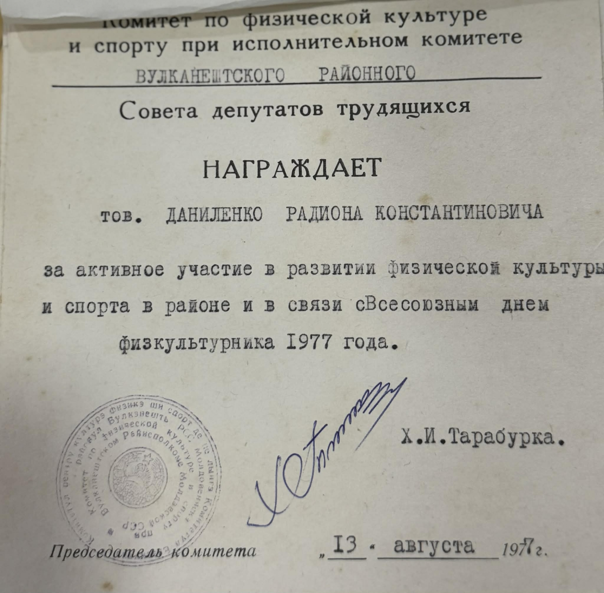 Diploma atestă acordarea unei distincții lui Danilenco Radion Constantinovici pentru participare activă la dezvoltarea culturii fizice și a sportului în raion, cu prilejul Zilei Unionale a Sportivului.