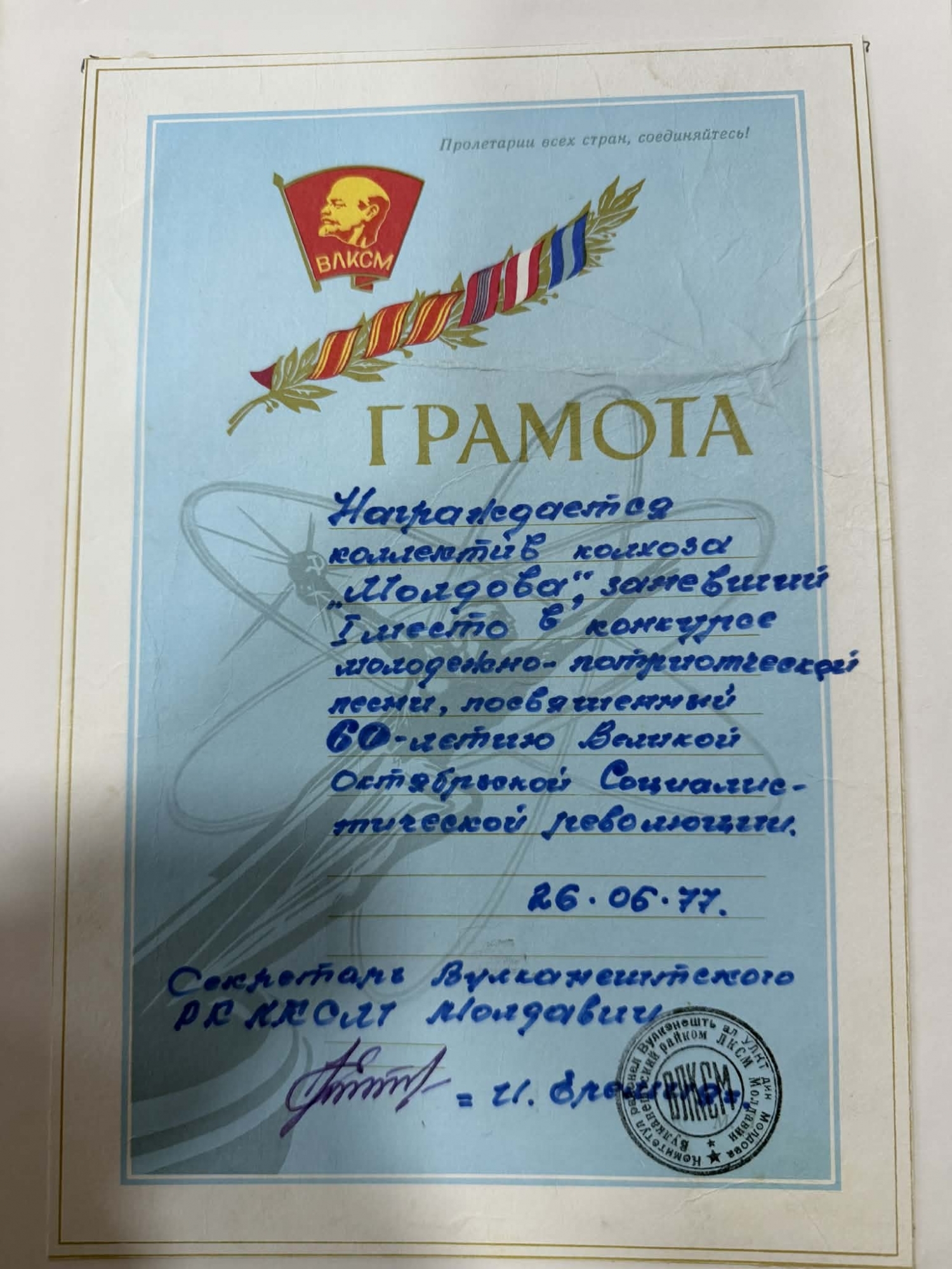 Diploma atestă acordarea distincției colectivului colhozului „Moldova” pentru ocuparea locului I în concursul muncii patriotice de tineret, dedicat celei de-a 60-a aniversări a Marii Revoluții Socialiste din Octombrie.