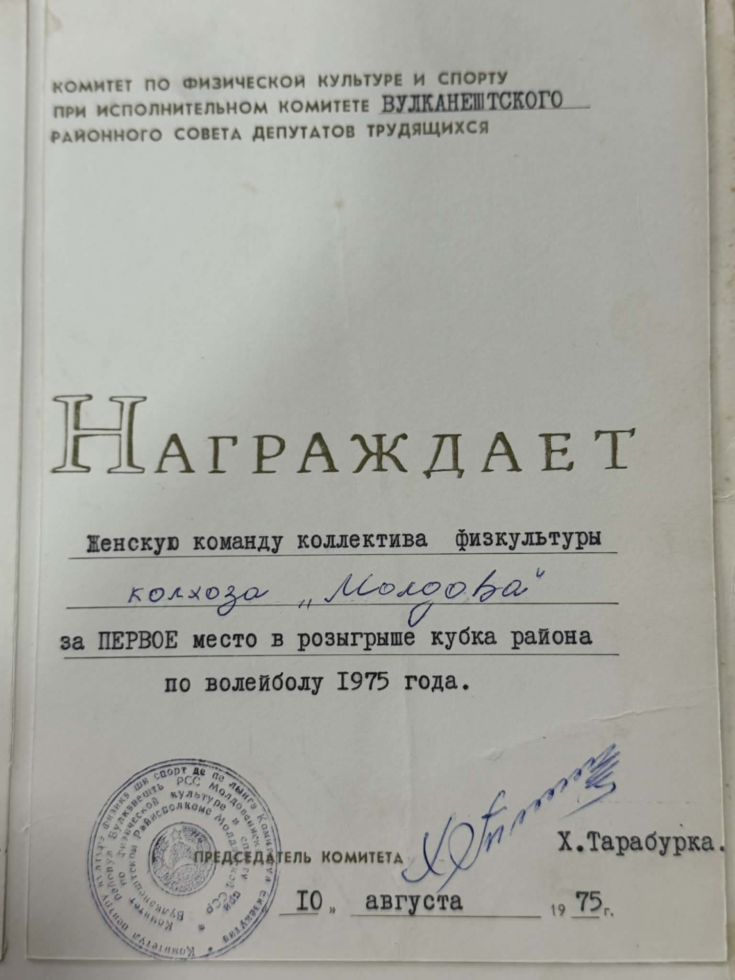 Diploma este acordată colectivului de femei de cultură fizică al colhozului „Moldova”, raionul Vulcănești, pentru ocuparea locului I la Cupa raională de Volei. Data: 10 august 1975.