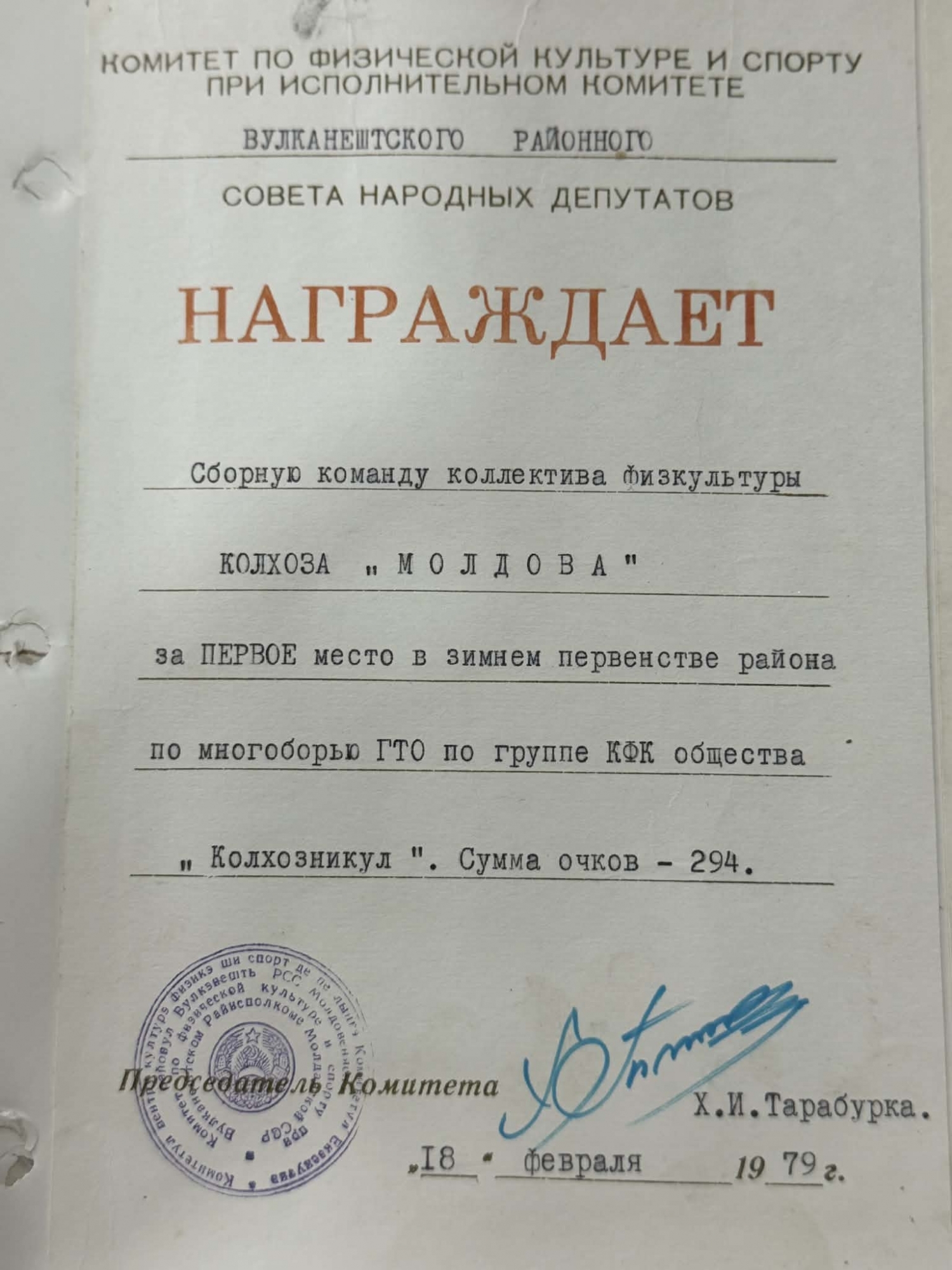Diploma este acordată echipei de cultură fizică la competiția districtuală de iarnă, cu total de 294 puncte.18 februarie 1979