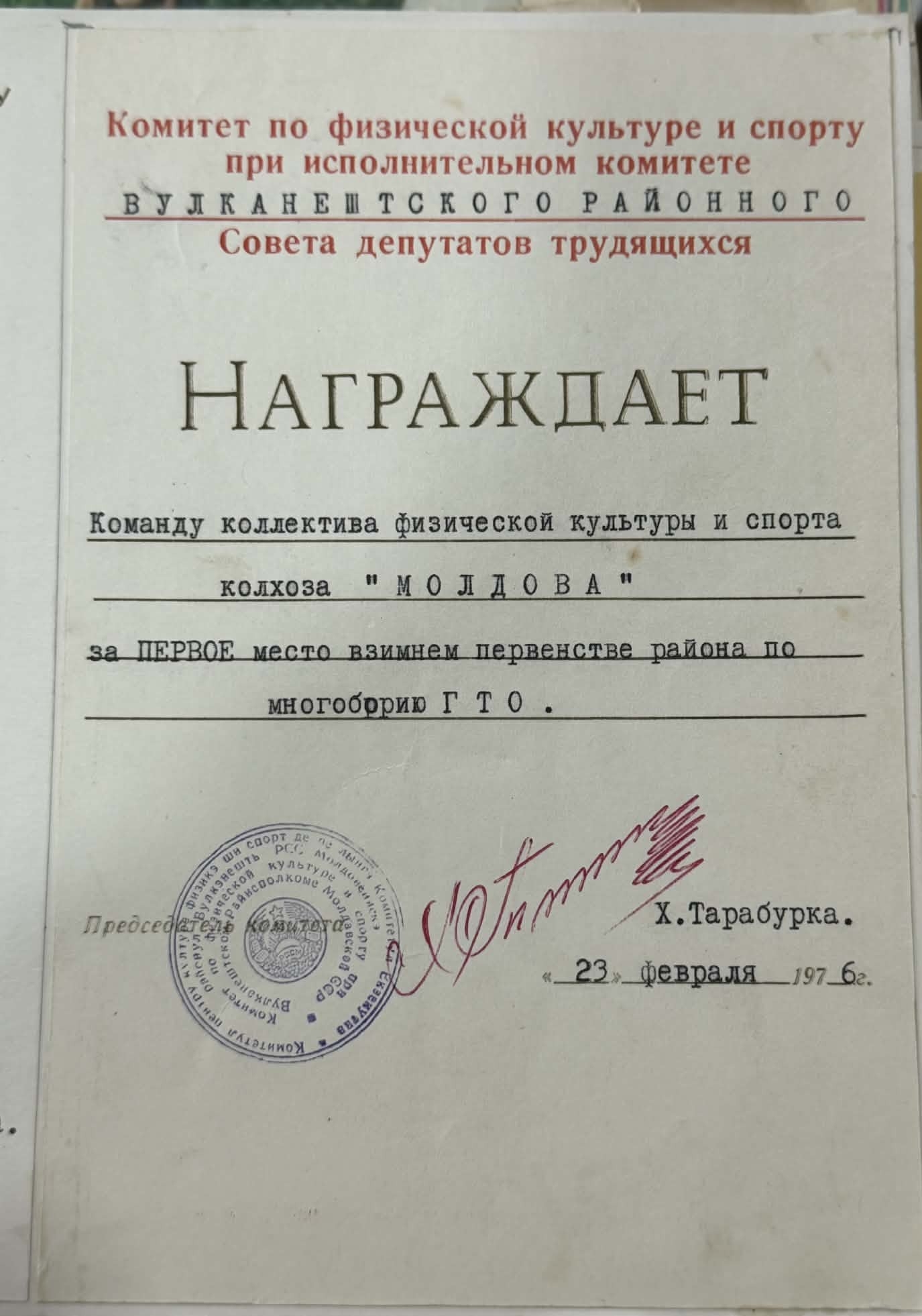 Diploma este acordată echipei de cultură fizică a colhozului „Moldova”, pentru ocuparea locului I la campionatul raional de iarnă la individual GTO. Data: 23 februarie 1976.