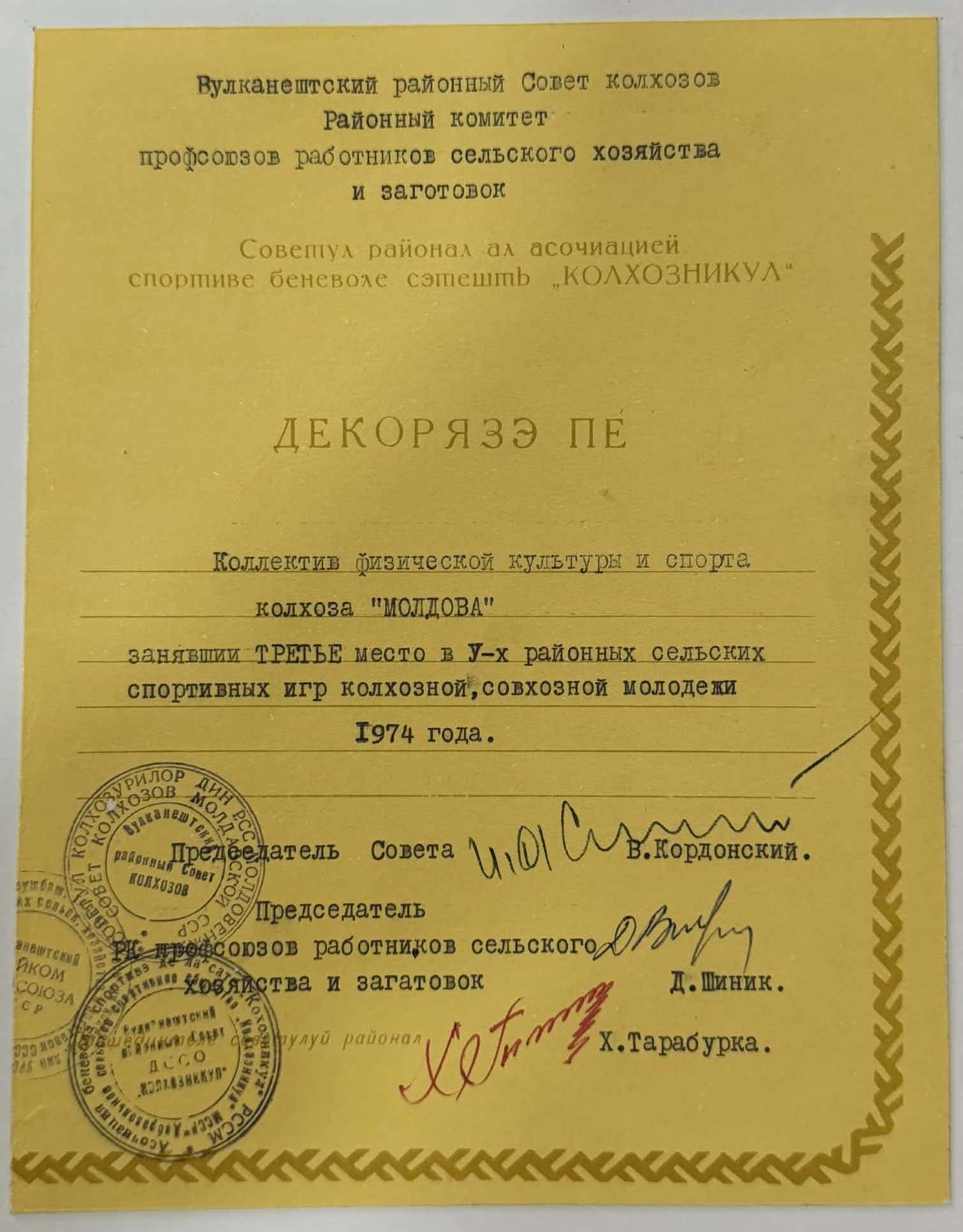 Diploma a fost acordată echipei de educație fizică și sport colhozului „Moldova”, pentru ocuparea locului III la jocurile sportive rurale pentru tineret.