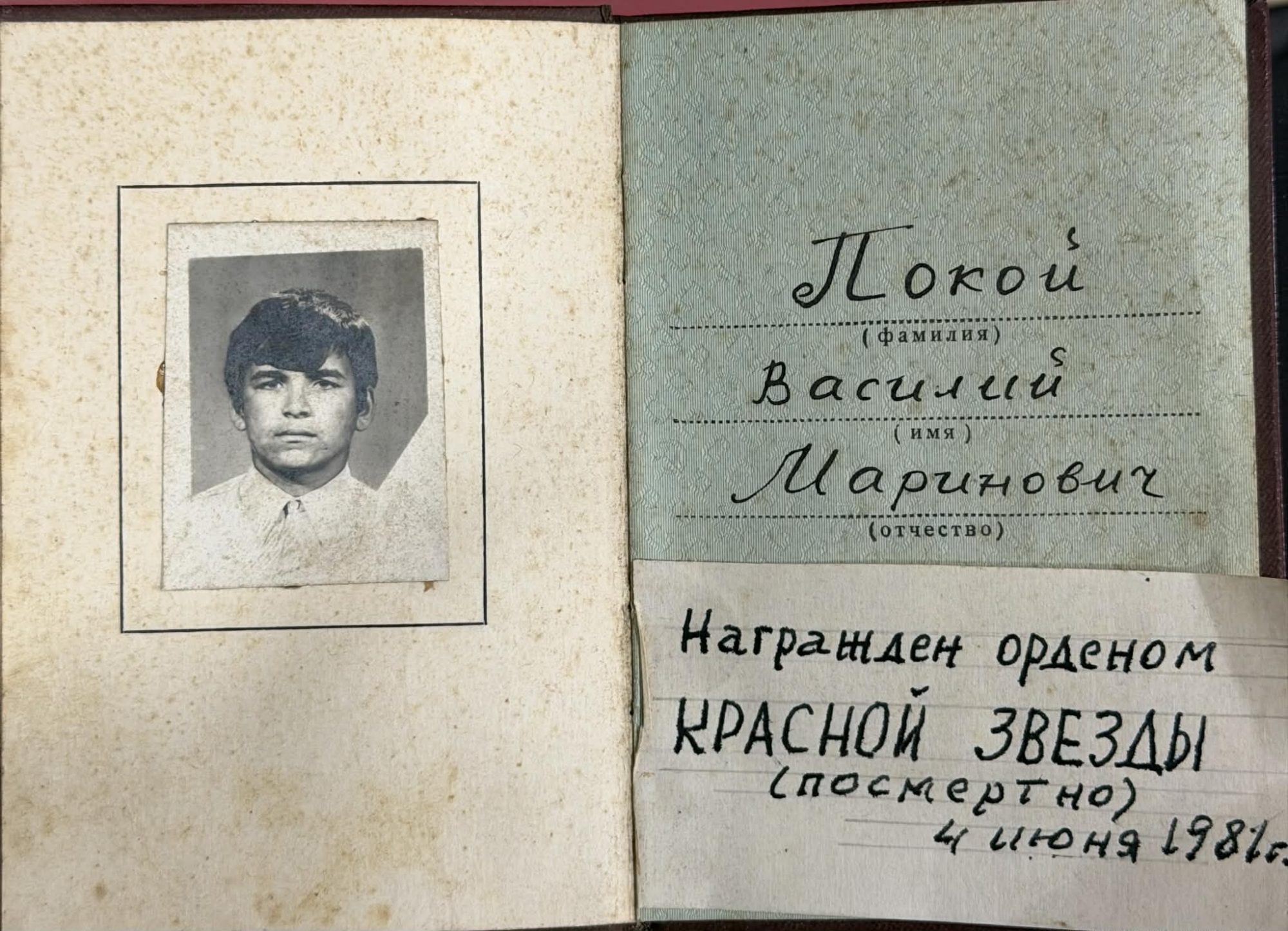 Document oficial sovietic tipărit, cu copertă rigidă, reprezentând legitimația care însoțea decorarea cu Ordinul „Steaua Roșie” (Орден Красной Звезды). Ordinul cu numărul 3656973 este consemnat ca fiind acordat post-mortem, fapt menționat explicit prin înscrisul olograf „(посмертно)”.