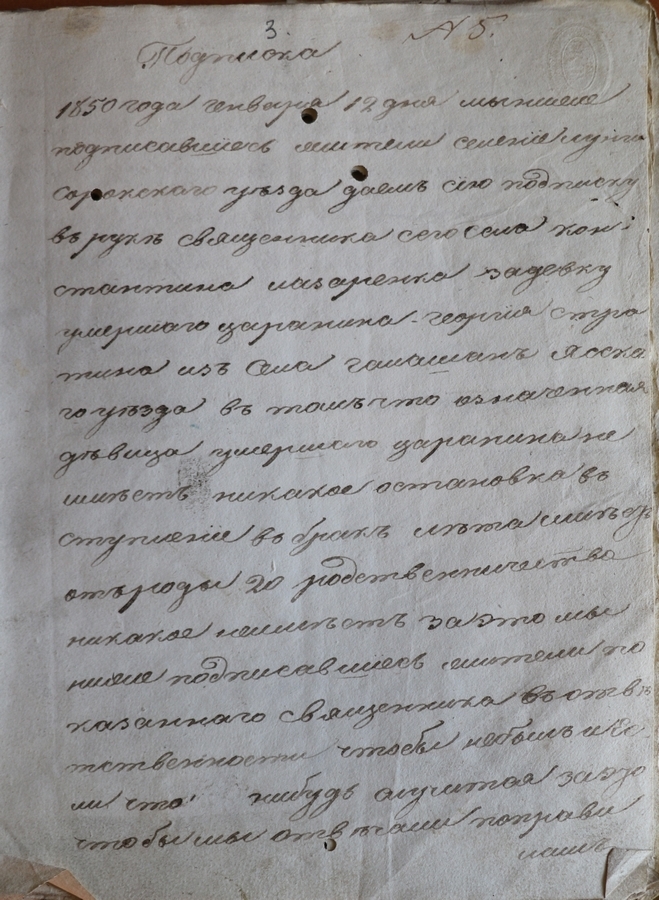Actul scris pe o singură filă, RV, conține un text de 18 rânduri ce se referă la mărturia eliberată pentru fiica țăranului Gheorghe Stratin din s. Gălășeni, jud. Iași și transmisă preotului Constantin Lazarenco de țăranii din s. Lunga, jud. Soroca. Actul mărturisește că această fată de 20 de ani nu are nici o interdicție de a se mărita, martorii asumându-și responsabilitatea în cazul unor situații neortodoxe imprevizibile. În calitate de martori s-au semnat cu punerea degetului țăranii din sat – Ion Hâncu, Vasile Stratin, Ion și Gheorghe Andrieș, amprentele fiind confirmate de semnătura pisarului Ostap din satul Lunga.