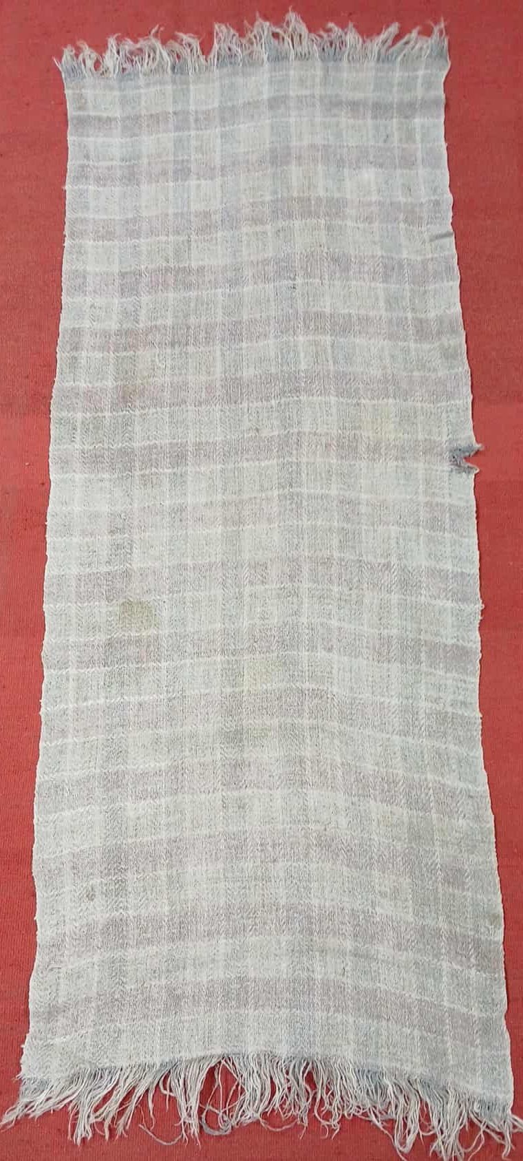 Țesătură dreptunghiulară, deschisă la culoare, cu structură rară și franjuri la capete.