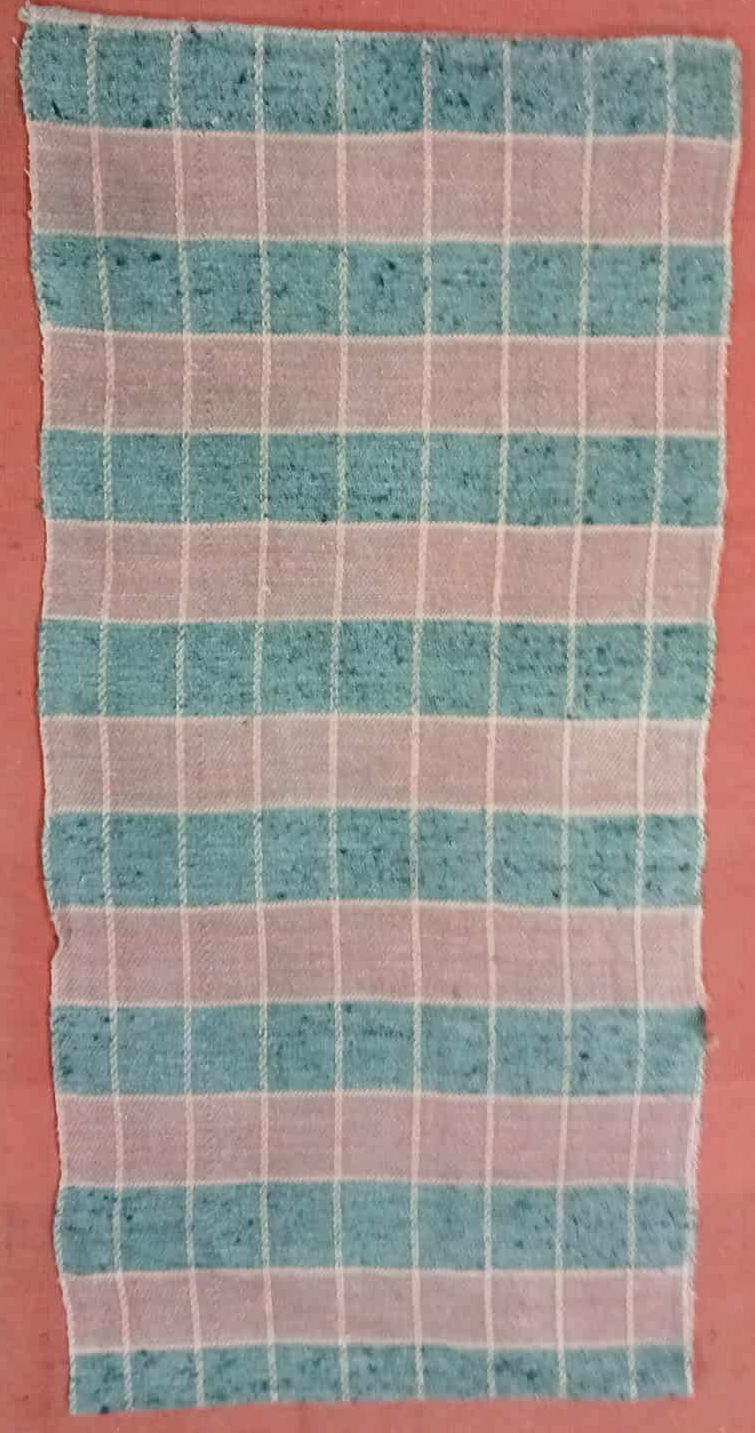 Păretar din lână, lucrat manual la război, cu margini ușor neregulate. Decorul este geometric, compus dintr-un câmp verde-turcoaz traversat de linii alb-crem dispuse în grilă, formând carouri regulate. Piesa ilustrează tehnica tradițională de țesut și funcția decorativă a textilelor de interior în gospodăria rurală.