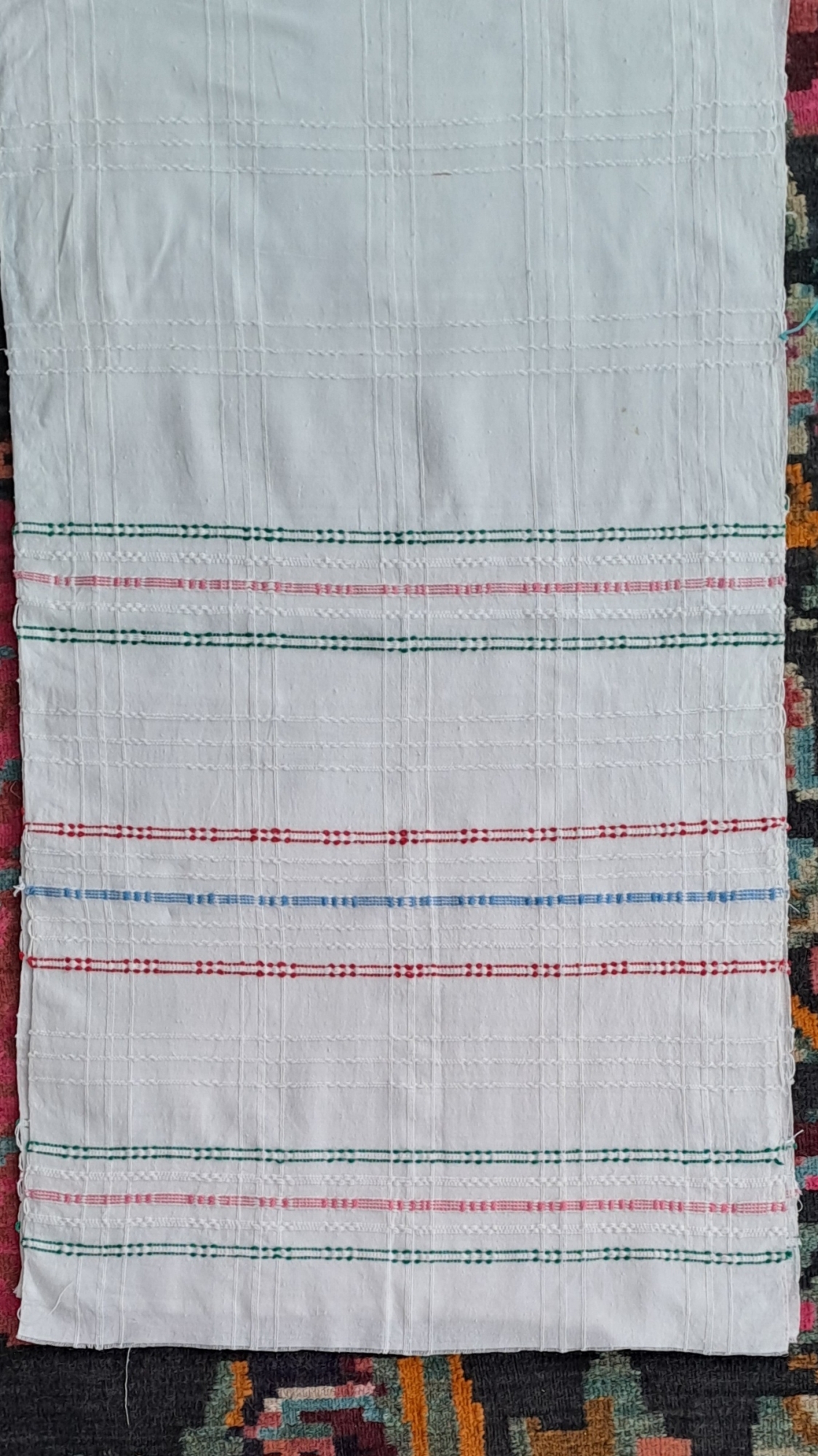 Piesă dreptunghiulară , țesut manual în stative ,în 3 ițe, cu câmp decorat cu rețea de carouri albe . La capetele laterale 3 registre, formate din linii orizontale policrome colorate. Cromatică; alb, roș, verde, albastru. La capete este tivit.