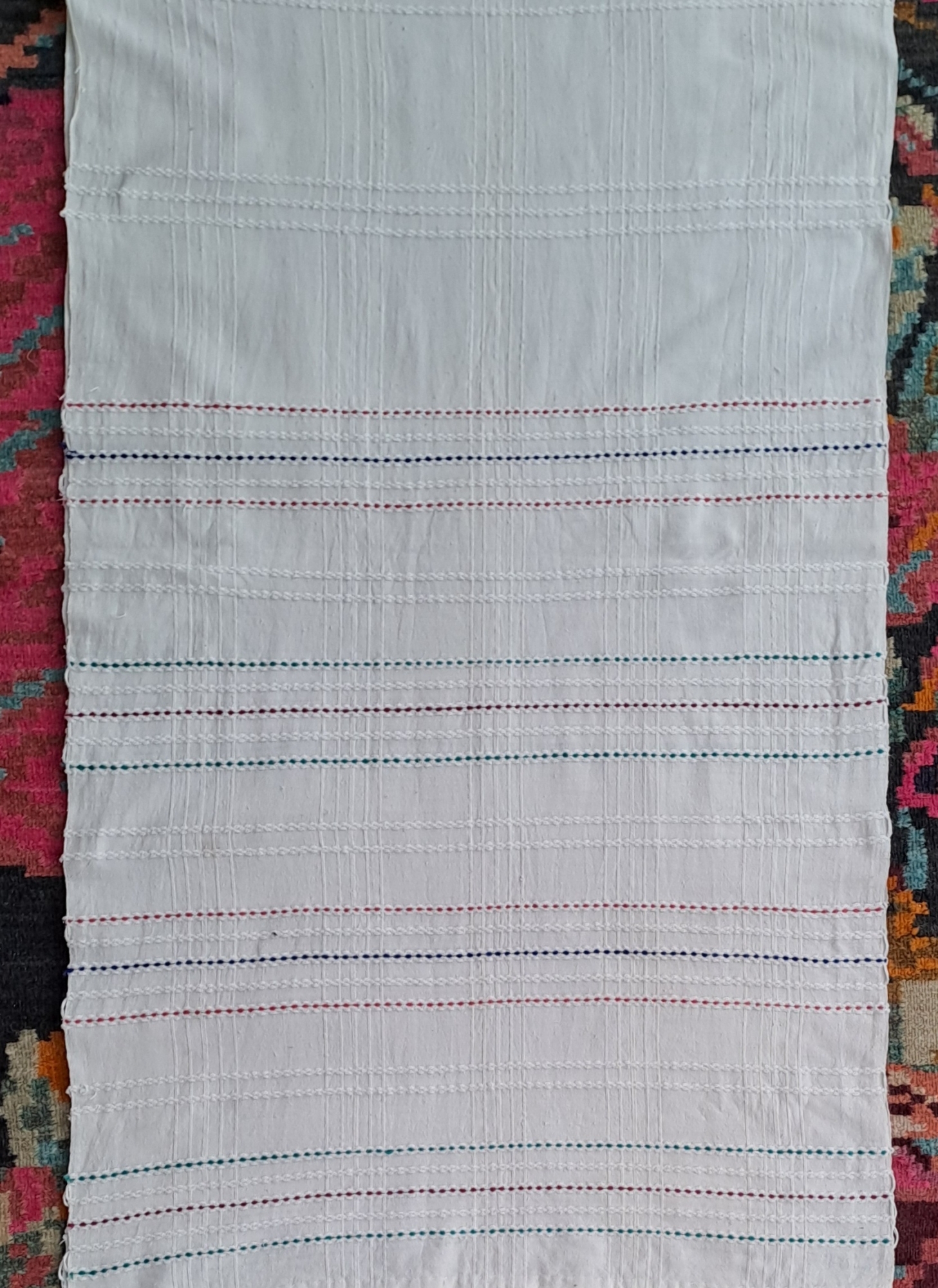 Piesă dreptunghiulară , țesut manual în stative ,în 3 ițe, cu câmp decorat cu rețea de carouri albe . La capetele laterale 5 registre, formate din linii orizontale policrome colorate. Cromatică; alb, roș, verde, albastru, vișiniu. La capete este tivit.