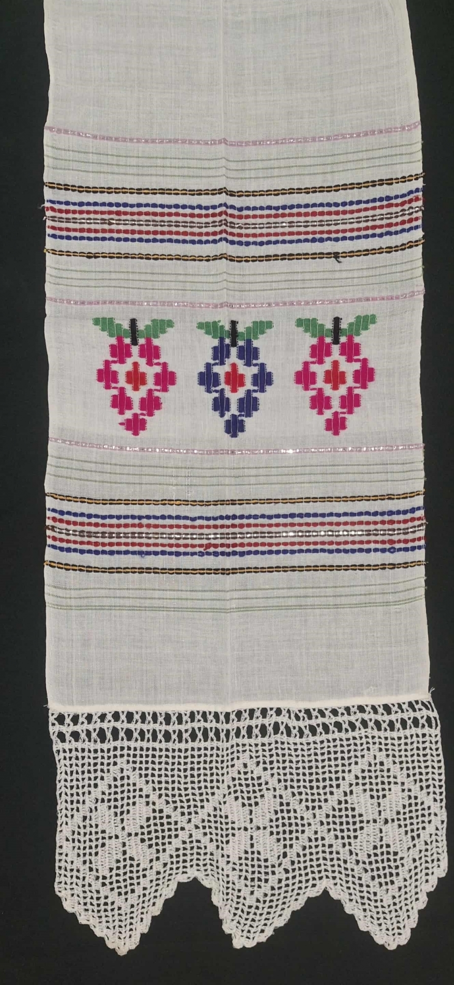 Prosop realizat manual. Pânza este țesută cu fir sintetic la războiul de țesut orizontal. Spre fiecare capăt latitudinal două grupe de vrâste. Grupele au linii în relief, în culori de brun, roșu, albastru, negru, galben și verde și roz. Între liniile brune și roz este fir metalic argintiu. În mijlocul grupelor de vrâste sunt 3 struguri, doi rozi prin părți și unul albastru pe mijloc. La fiecare capăt latitudinal al piesei este dantelă (horboțică) confecționată manual la croșetă. Drept ornament are 3 romburi în lanț, a căror centru este umplut cu câte o floare cu 4 petale. Margina de jos este ondulată.