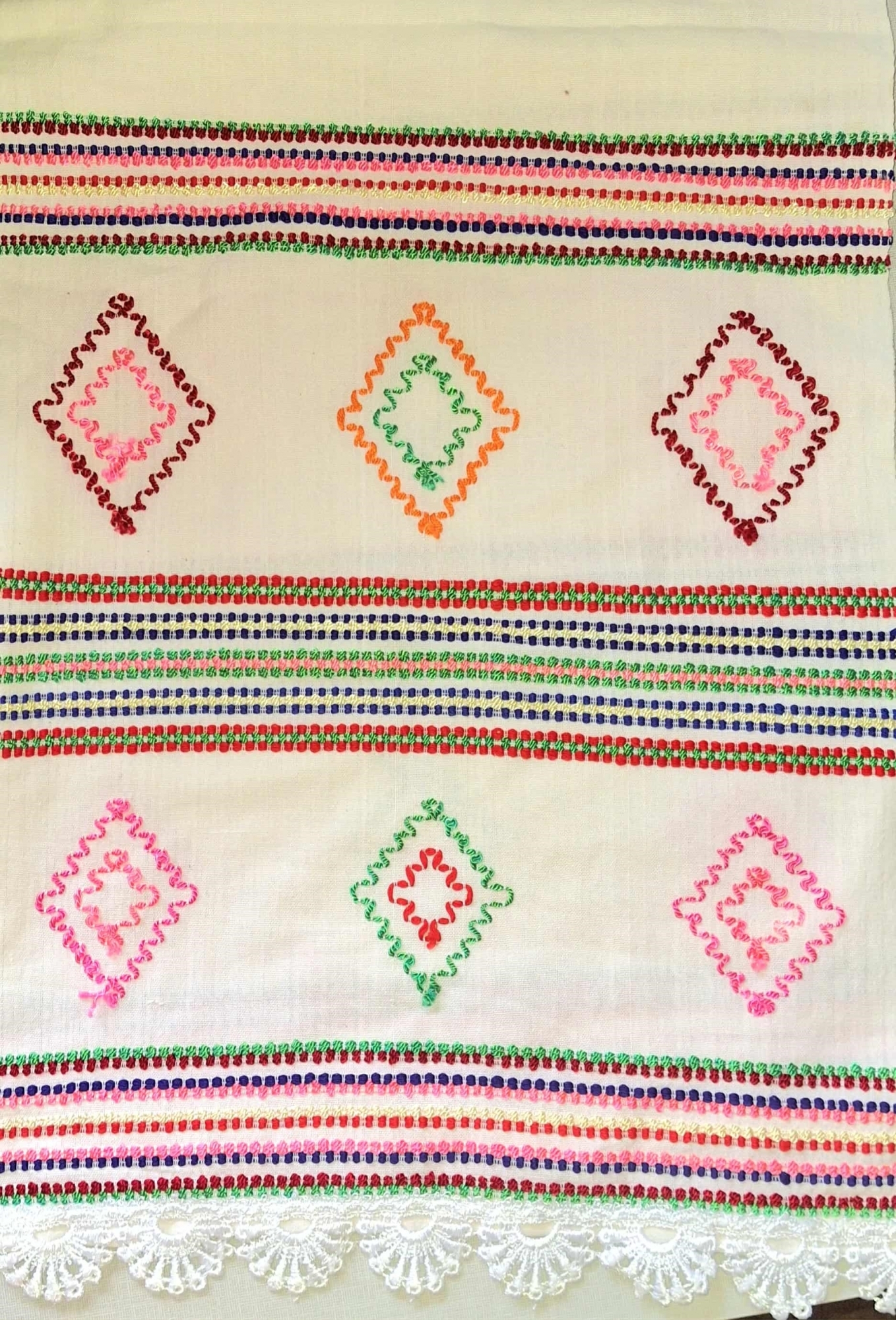Prosop realizat manual. Pânza este țesută cu fir sintetic la războiul de țesut orizontal. Spre fiecare capăt latitudinal sunt trei grupe de vrâste. Grupele au linii multicolore în relief. Între grupe sunt două rânduri de romburi, a câte trei pe rând. În fiecare romb mai este un romb mic. La fiecare capăt latitudinal al piesei este dantelă industrială din fir sintetic. Dantela are ca ornament 8 semicercuri.