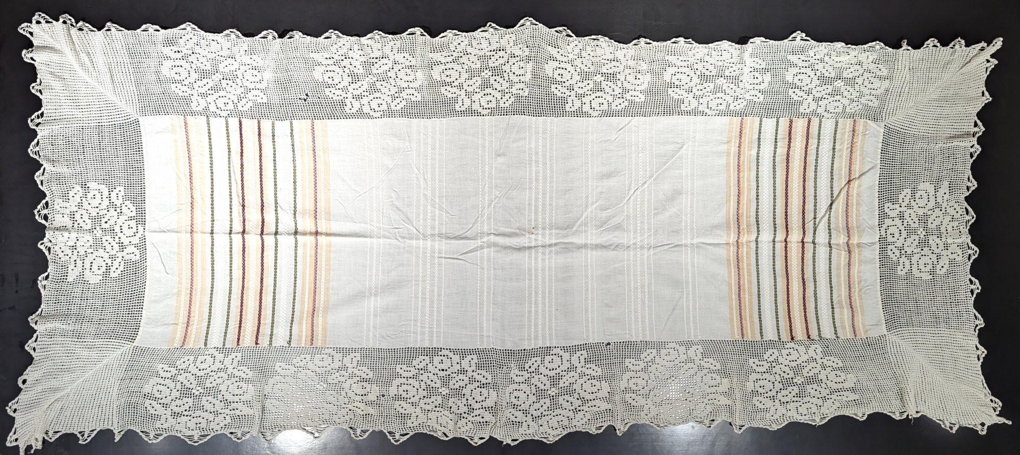 Prosop/ștergar tradițional țărănesc, cu dantelă croșetată manual de jur împrejur. Prosopul este confecționat din pânză albă de bumbac țesut la stative. Vârste, realizate din fire colorate discret – nuanțe de roșu, verde, bej și brun – dispuse ritmic. Compoziția vrâstelor: în părțile laterale avem câte 5 grupări de vrâste a câte 3 vrâste fiecare grupă încadrate în benzi de culoare albă și calacan. În partea de mijloc avem 7 benzi de vrâste: 4 benzi a câte 3 vrâste și 3 benzi a câte 5 vrâste, toate de culoare albă. Dantela este croșetată manual, bogat ornamentată, cu motive geometrice și florale stilizate. Pe părțile laterale se află câte 6 flori și câte una pe părțile extreme în total 14 flori. Pe colțurile extreme avem câte un pătrat în total 4 pătrate. Marginile dantelei sunt ondulate cu terminații decorative: zimțate.