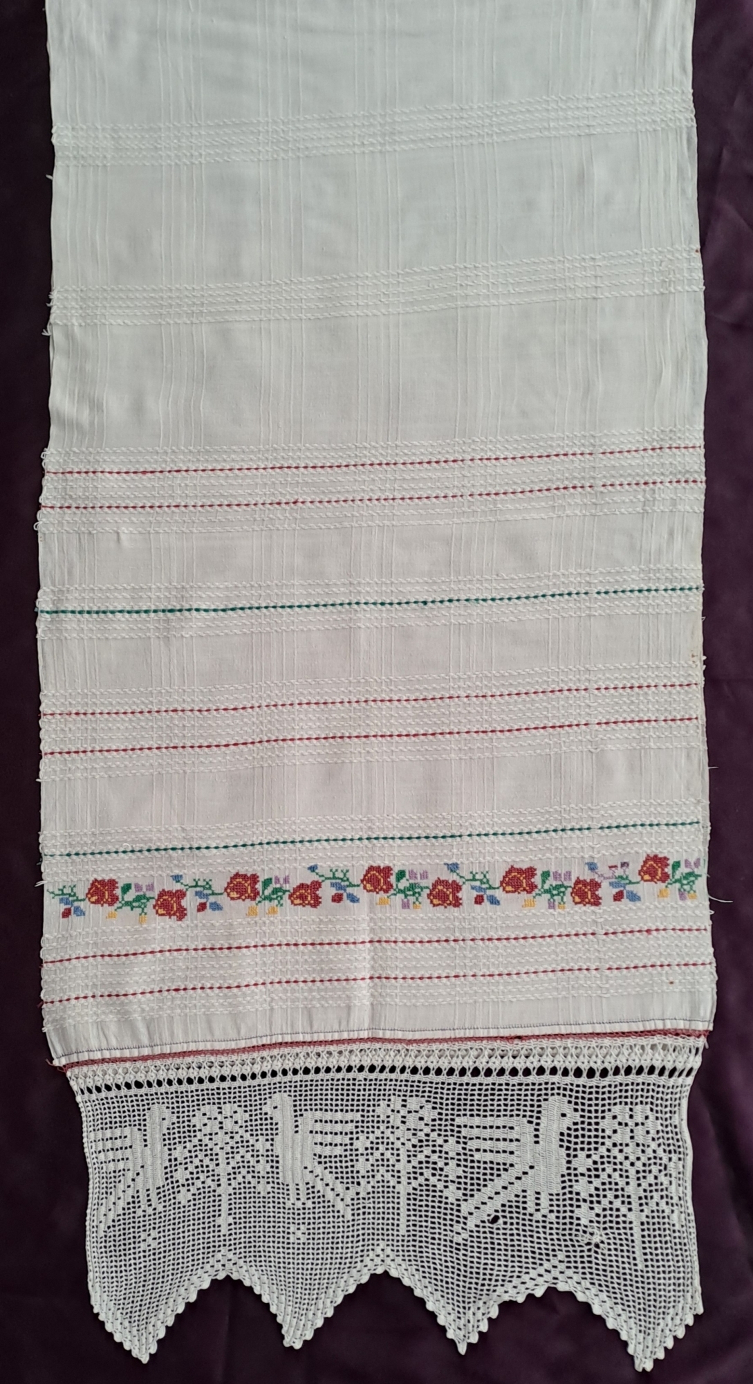 Piesă dreptunghiulară , țesut manual în 3 ițe, cu câmp decorat cu rețea de carouri. La capetele laterale 5 registre, formate din linii orizontale policrome, un registru cu ornament floral. La capete înfrumusețat cu horboțică cu 4 colțuri , motive ornamentale fitomorfe și avimorfe ( flori și păsări). Cromatică; alb, roș, verde, albastru, violet, galben.