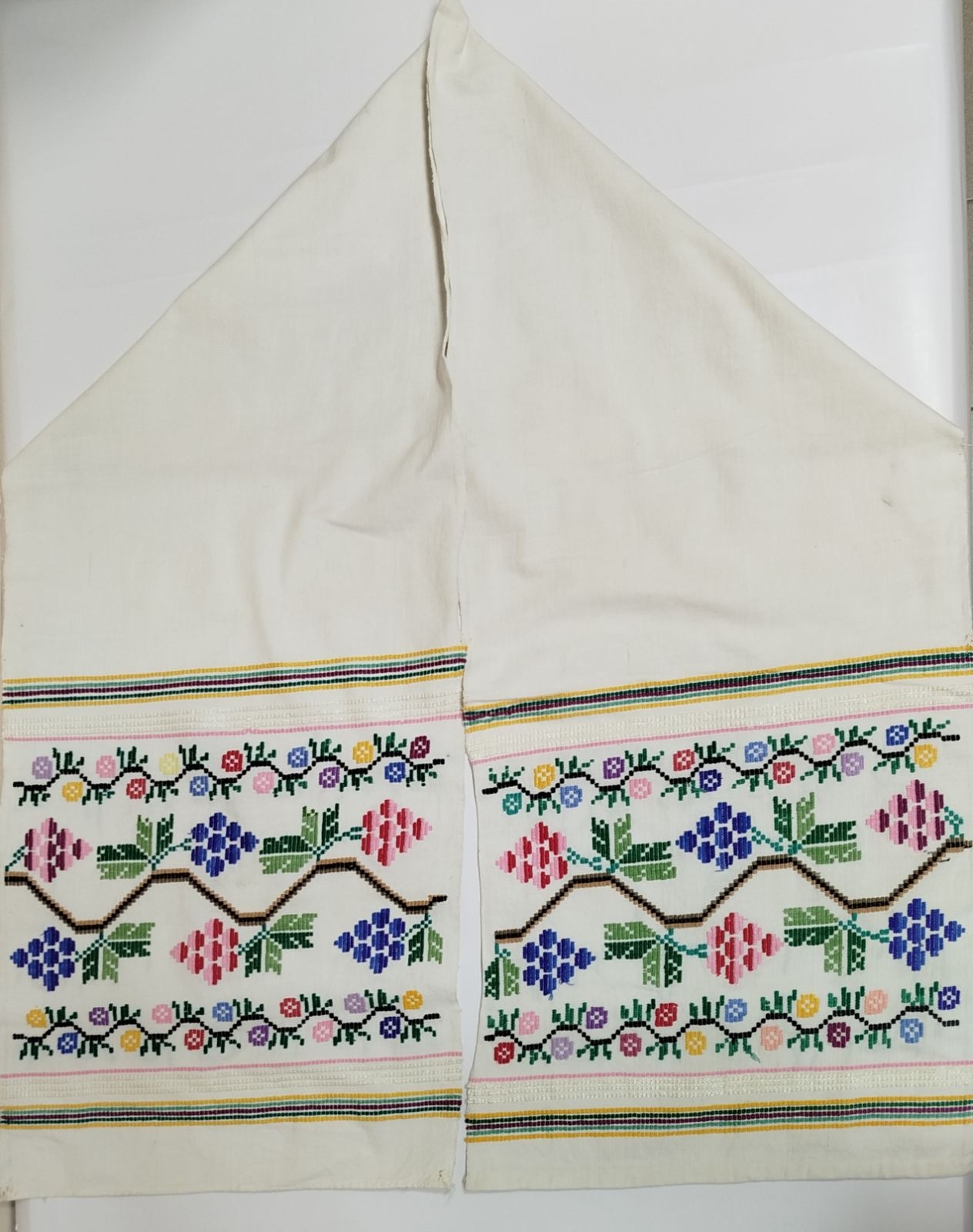 Formă dreptunghiulară, dintr-o bucată, ornamentat la capete cu vrâste (fire alese) de diferite culori, formate în timpul țeserii, ales printre fire, ales cu speteaza prosopul e ornamentat cu motive florale și motive vegetale stilizate: două rânduri de flori și între ele sunt dispuse struguri de poamă, liniile ornamentului sunt ondulate. Cromatica: alb, roz, galben, vișiniu, verde, albastru, roșu, maro de diferite nuanțe.