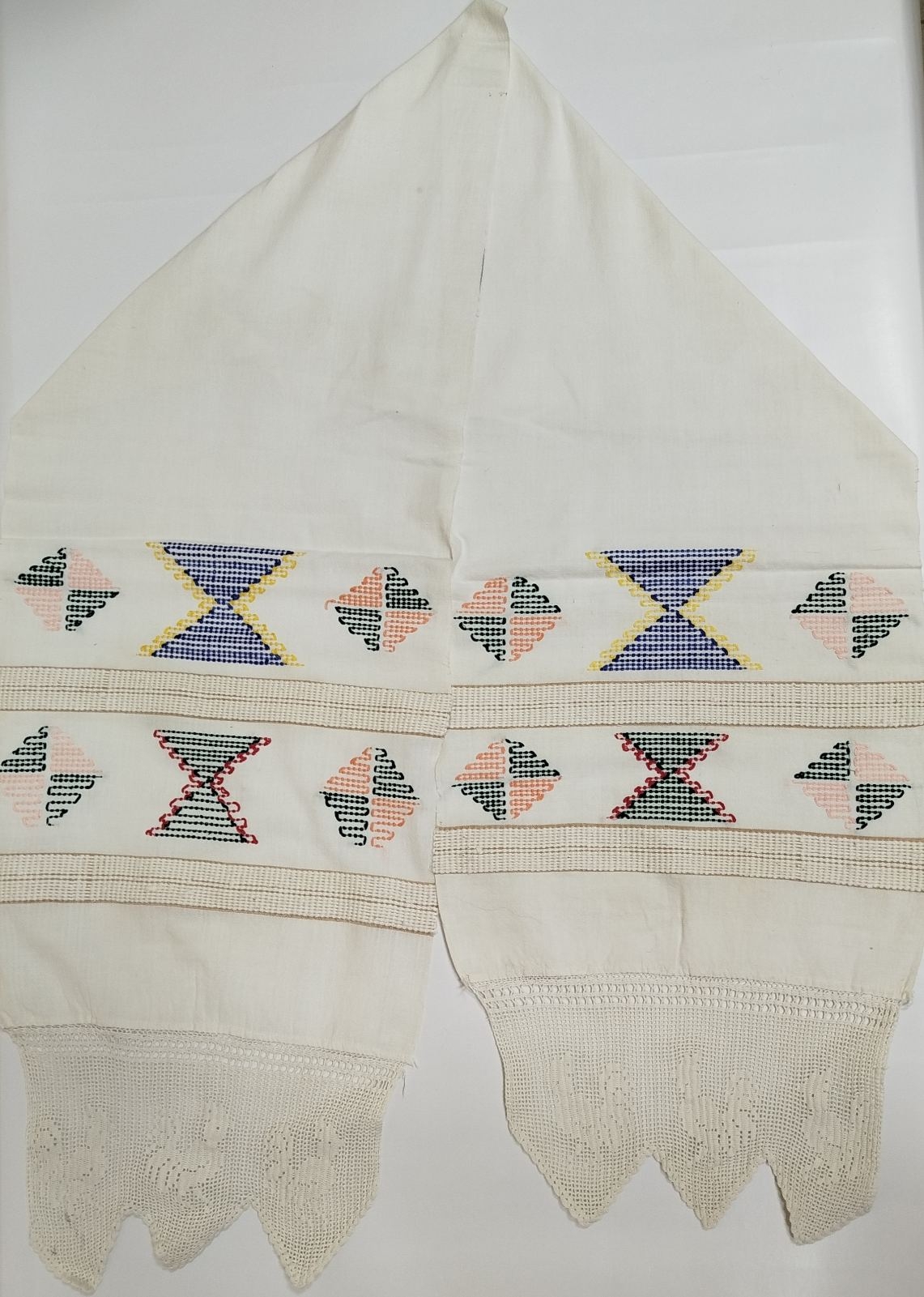Formă dreptunghiulară, dintr-o bucată, ornamentat la capete cu vrâste (fire alese) de culoare albă, fomate în timpul țeserii, ales printre fire, ales cu speteaza. Prosopul e ornamentat cu motive geometrice, stilizate în două rânduri; triunghiuri, fomând clepsidră și romburi. Cromatica: roz cețos, galben, verde, albastru, coral deschis, roșu, maro