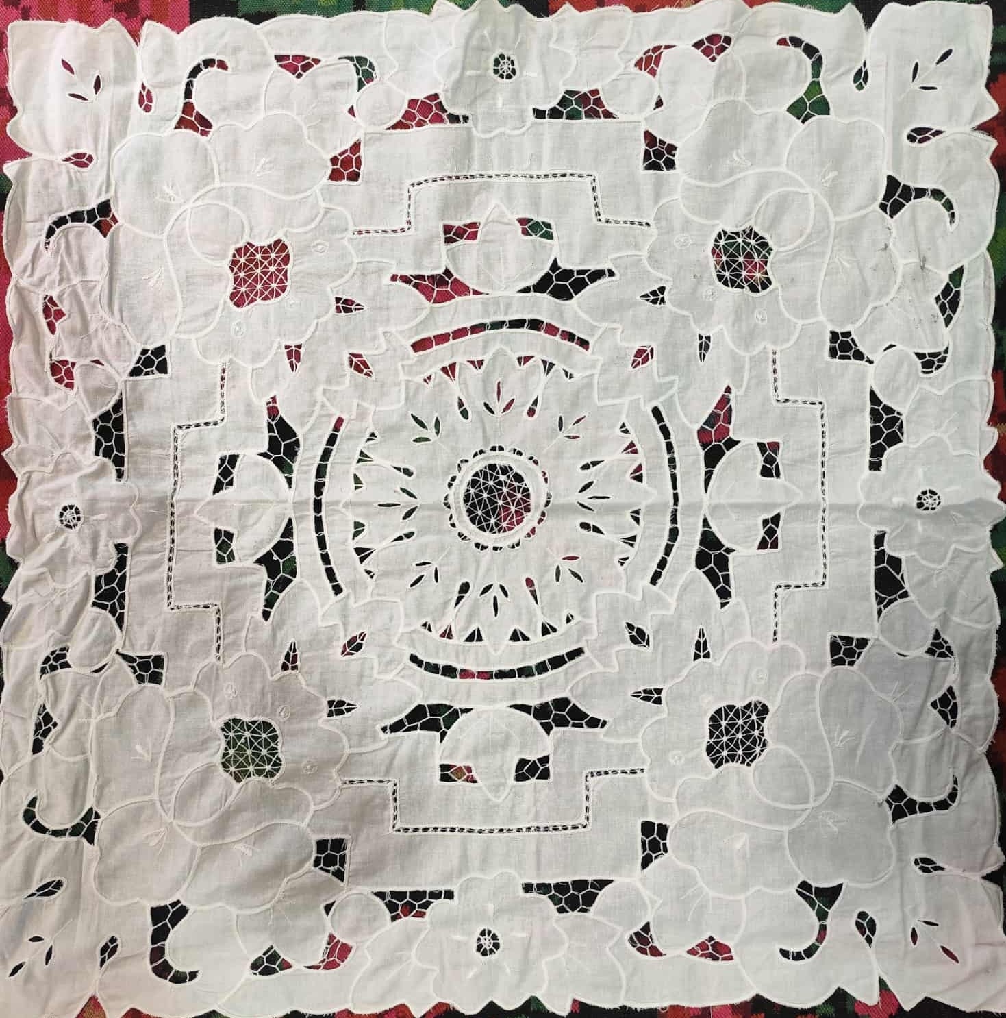Țesătură din pînză albă de bumbac, decorată manual prin broderie cu ajur și decupaje. Are formă pătrată și este decorată cu motive florale stilizate dispuse simetric pe întreaga suprafață. În partea centrală se observă un medalion circular cu broderie ajurată fină, înconjurat de modele radiale asemănătoare petalelor. Marginea este ornamentată cu flori mari brodate și decupate, unite prin motive geometrice și cusături decorative.