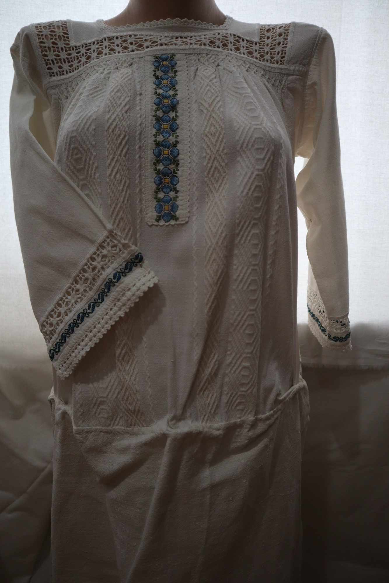 Cămașă cu poale, de sărbătoare, croită cu platcă și cu mâneca din umări. Prin părți cu clini laterali și pavă sub braț. Pieptul cămășii este decorat prin țesătură cu ață de tereplic și borangic în cinci și două ițe cu ornament geometrizant.La mijloc cămașa are o fîșie de pânză adăugată cu broderie vegetal -florală în tehnica ”pe fir”.Marginea mânicilor și în jurul gâtului este decorată cu broderie în tehnica ,,Rechilieu”, urmată de broderie cusută ”în cruciuliță” ornament vegetal stilizat plasat la marginea manșetelor și finisare cu dantela croșetată. La poale dantela este croșetată cu ornament floral.