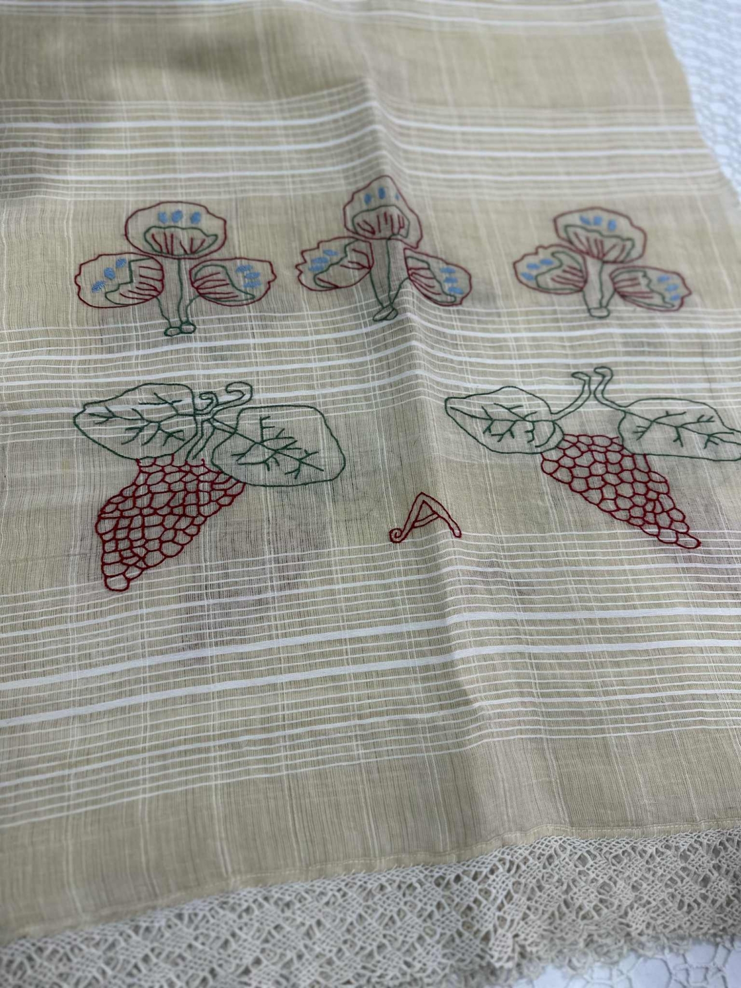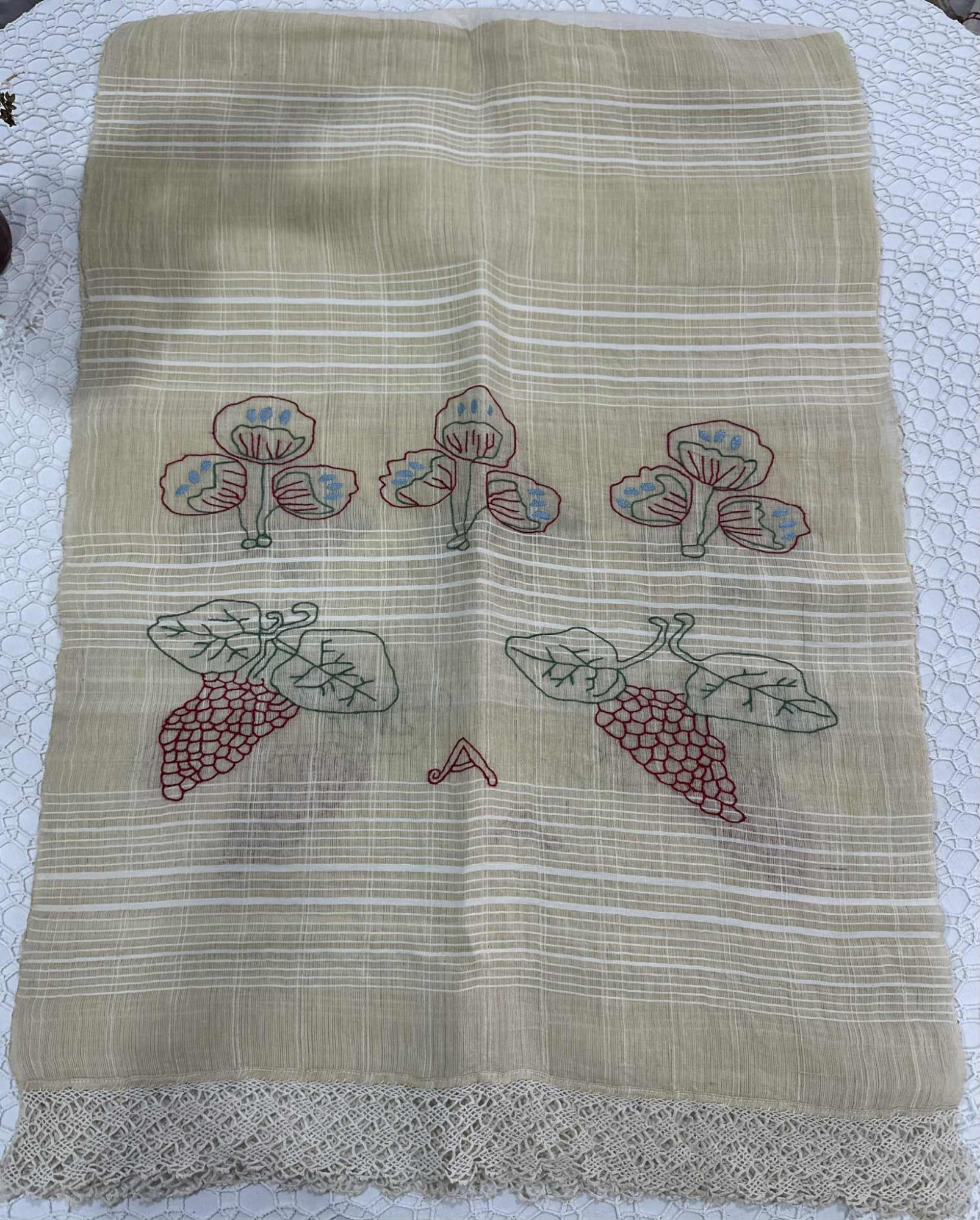 Prosop tradițional realizat din pânză de bumbac țesută manual, decorată cu motive brodate. Țesătura are fond bej-deschis, înfrumusețat cu dungi orizontale albe, dispuse ritmic. Ornamentica este simplă și armonioasă, compusă din două registre cu motive vegetale: în partea superioară se disting flori stilizate brodate cu ață roșie și accente albastre în mijloc, iar mai jos sunt reprezentați doi ciorchini de struguri roșii însoțiți de frunze verzi. Între acești doi struguri este brodată și o inițială „A”, cu ață de culoare roșie.