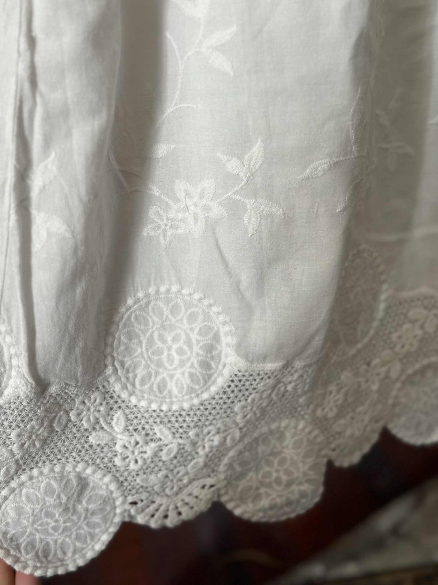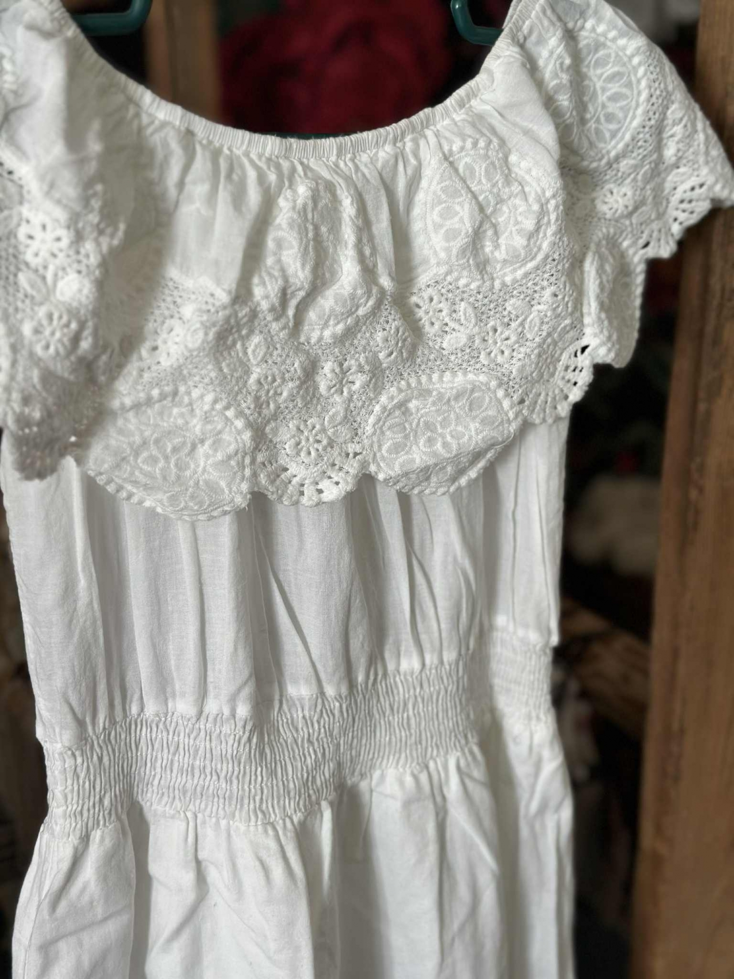 Rochia albă, lejeră, cu elastic în talie și dantelă amplă aplicată la guler și tiv. Partea superioară este decorată cu volan larg, brodat cu motive florale, prin tehnica broderiei sparte, care acoperă umerii și partea pieptului. Tivul rochiei este de asemenea conturat cu dantelă bogată, înflorată, conferind piesei delicatețe și rafinament.
