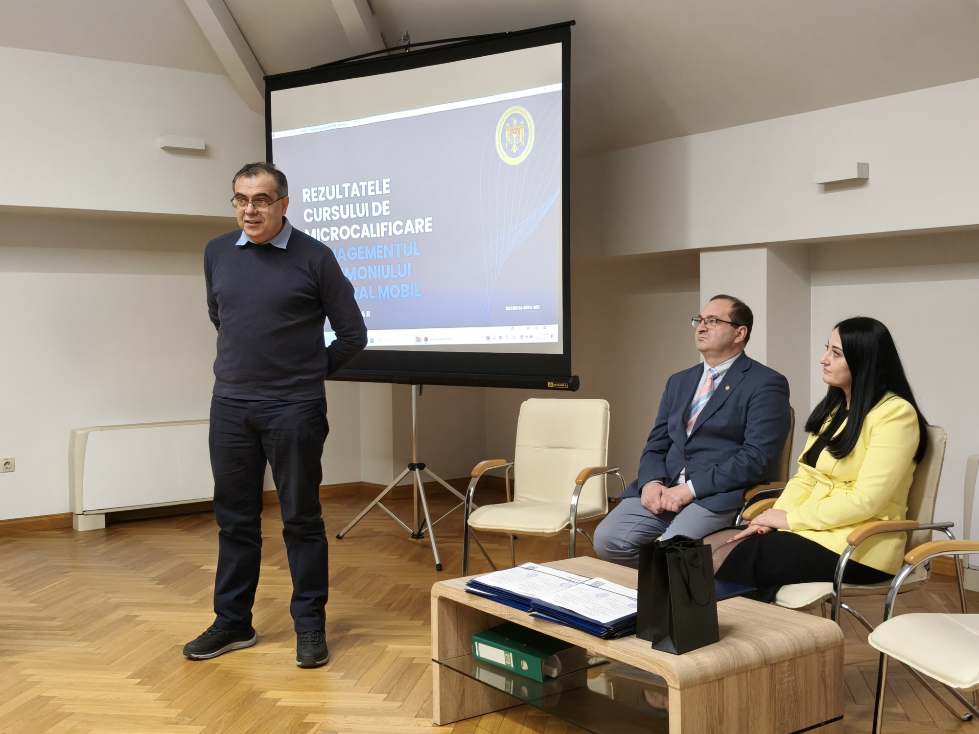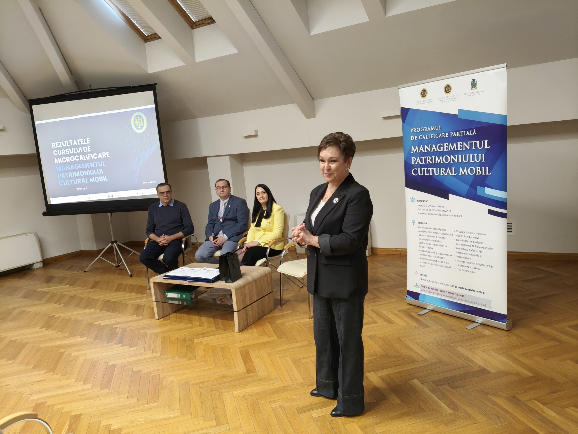 Doamna Svetlana Pociumban, Director al Serviciului de Evidență și Circulație a Bunurilor Culturale Mobile, a prezentat finalitățile Programului, evidențiind recomandările formulate de cursanți în lucrările de absolvire și relevanța acestora pentru fundamentarea politicilor publice și strategiei în domeniul circulației licite a bunurilor culturale mobile.