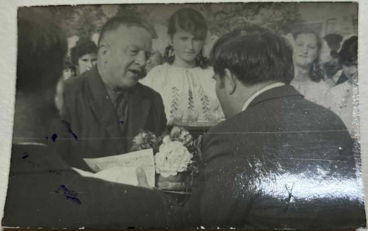 Întimpinarea cu pâine și sare a candidatului în deputați în Sovietul Suprem al RSSM - Țurcanu. În imagine Țurcanu primește flori, pâine și sare: Este îmbrăcat în costum de culoare închisă, cămașă albă. Îm spate este un grup de eleve îmbrăcate în haine populae cu fundițe albe prinse în păr.