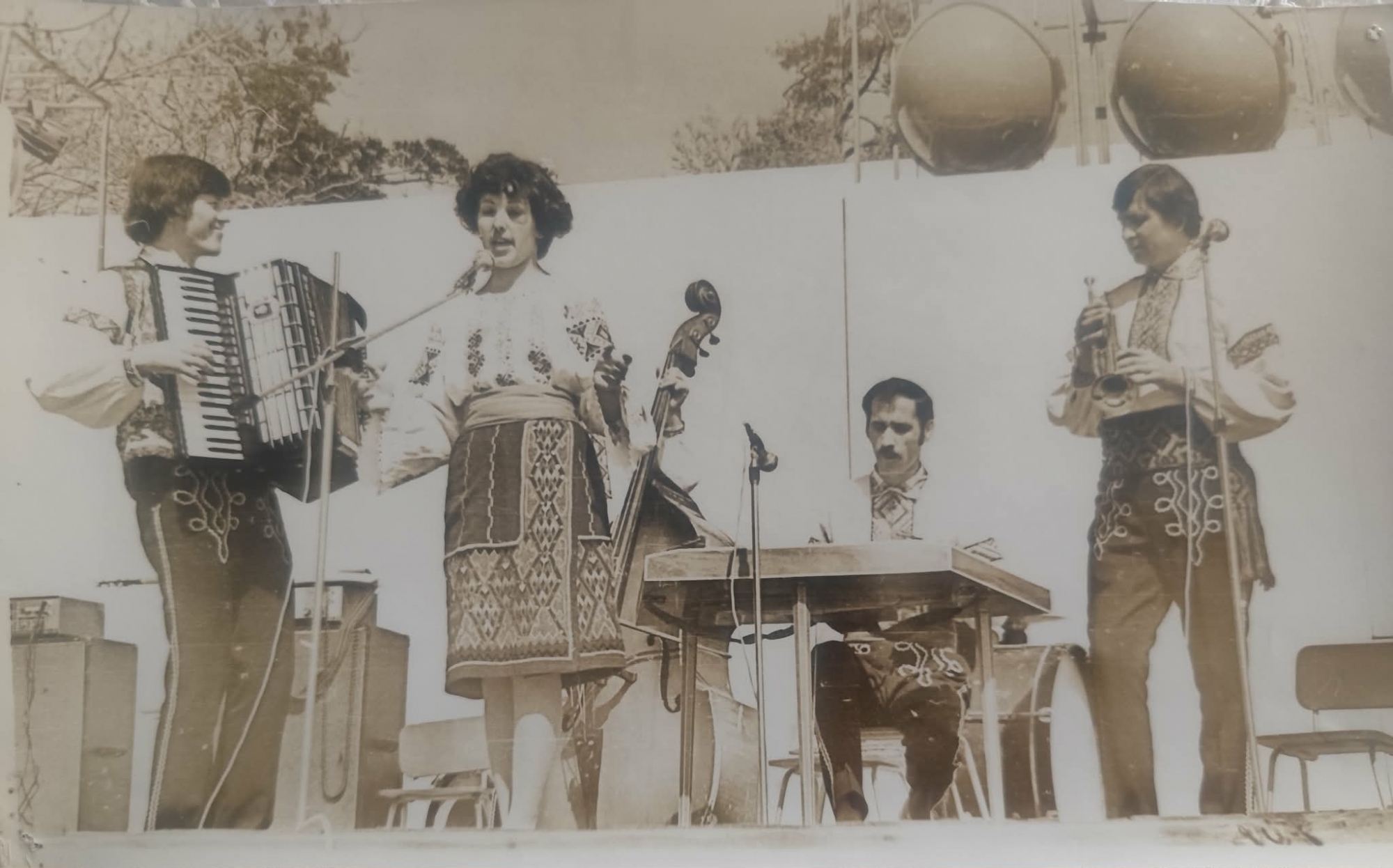 Fotografia alb negru prezintă ansamblul familei Crăciun format din patru instrumentiști și o solista Crăciun Elena, cu părul scurt și ondulat, surprinsă în timp ce cântă la un microfon vintage. Poartă un costum popular autentic, bogat ornamentat, cu o cămașă (ie) cu mâneci largi și broderii geometrice complexe, completată de o catrință cu motive tradiționale. Acordeonistul este Nicolae Crăciun, și este îmbrăcat într-un costum popular stilizat pentru scenă, cu pantaloni închiși la culoare decorați cu broderii aplicate pe coapse. La țambal este Ilie Perju, un bărbat cu mustață, concentrat asupra instrumentului, ce poartă, de asemenea, o cămașă cu motive tradiționale la gât și piept. La trompetă, purtând un costum similar cu cel al acordeonistului, evidențiind unitatea vizuală a ansamblului (brâu lat decorat și broderii pe pantaloni) este Vasile Plăcintă. Deși parțial mascat de țambal și solistă, se observă prezența unui set de tobe în spate. Aceștia căntă pe o scenă în aer liber, cu un fundal neutru ,în partea din dreapta sus se observă două proiectoare mari, sferice, specifice iluminatului de scenă din acea epocă.