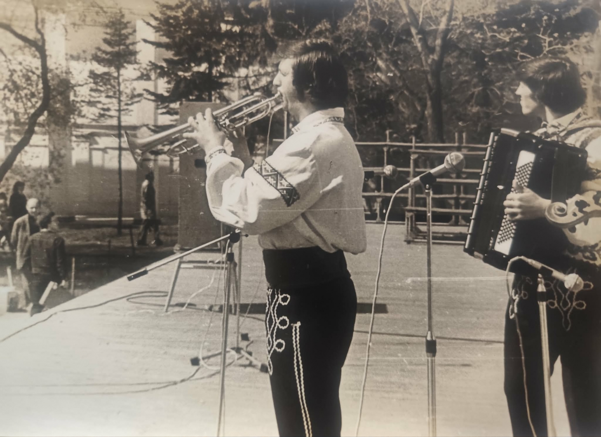 Fotografia alb negru prezintă imaginea din profil a doi membri a Ansamblului familial Crăciun, Mihai Crăciun la trompetă și Nicolae Crăciun la acordeon. Aceștia sunt îmbrăcați în costume populare tradiționale, specifice satului Slobozia Mare. Trompetistul poartă o cămașă albă cu broderie geometrică pe mâneci, un brâu lat de culoare închisă și ițari (pantaloni) decorați cu găitane albe (șnururi ornamentale) pe lateral și în zona buzunarelor. Acordeonistul poartă de asemenea o cămașă și o vestă cu motive tradiționale complexe. Aceștia cîntă pe o scenă în aer liber. Se pot observa mai multe stative de microfon metalice și cabluri întinse pe jos. În spatele trompetistului se află o boxă mare de lemn, tipică sistemelor de sonorizare de tip "monolit" din acea perioadă. În partea stângă, în plan îndepărtat, se văd câteva siluete de spectatori (adulți și copii) care urmăresc reprezentația, oferind o scară umană și o notă de realism social momentului.