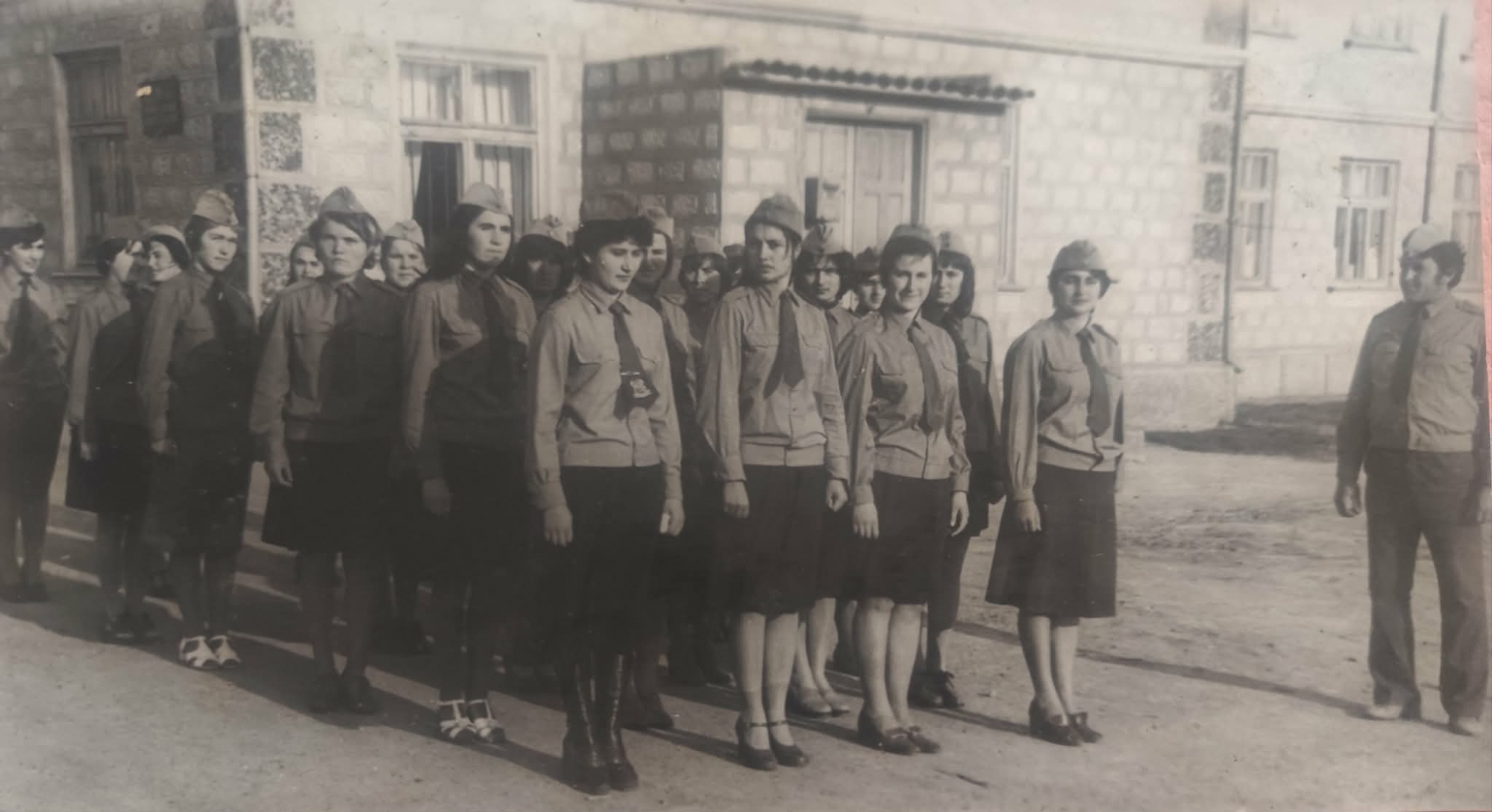 În fotografia alb negru apare un detașament de tinere care fac parte din Echipa de fete a Colhozului ,,Moldova,, îmbrăcate în uniforme specifice: cămăși de culoare deschisă cu mânecă lungă, cravate închise la culoare, fuste midi de culoare închisă și bonete pe cap. Aceste fete sunt Maria Paladi, Olga Buzilă, Olga Covalgiu, Ecaterina Saghin, Ala Ivașco, Ecaterina Madinoi, Vasilisa Caragherghe, Culeva Maria, Șcurea Maria, Dedin Ecaterina, Berbec Teodora, Lungu ana, care participau la concursul militar sportive ,,Orlevoc,,. Conducătorul echipei de fete este Danilenco Radion, acesta purtând o variantă masculină a uniformei, pantaloni și o cămașă similară, având o atitudine de coordonare a grupului. Fetele sunt aliniate în formațiune de careu, lîngă clădirea colhozului Moldova, clădire cu două etaje din blocuri de beton cu ferestre mari.