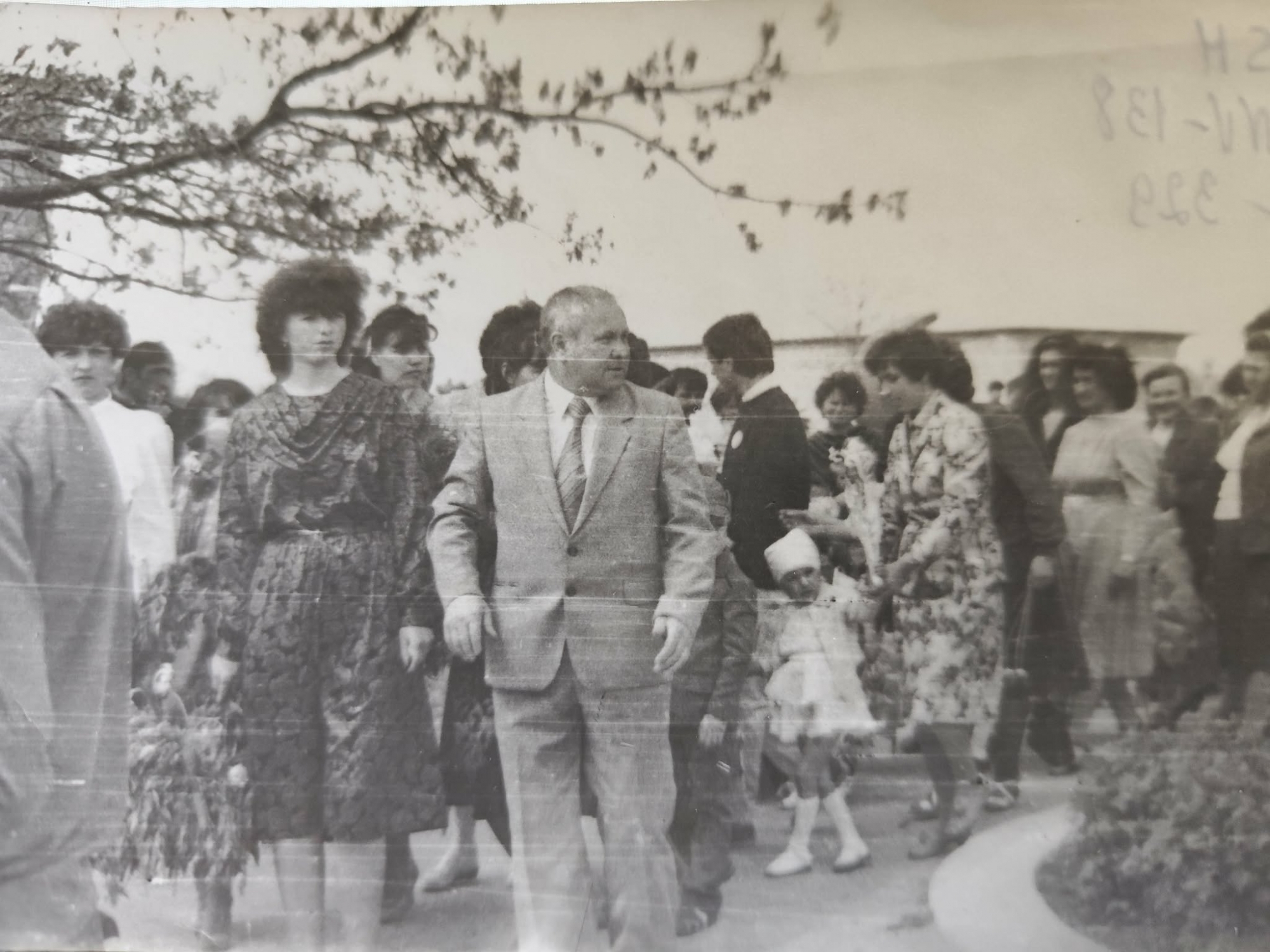 Fotografia alb negru prezintă momentul de depunere a florilor la monumentul eroilor căzuți în al Doilea Război Mondial. Se observă un bărbat, îmbrăcat într-un costum de culoare deschisă, cu cravată. Are o constituție robustă și părul scurt, grizonat. Expresia sa este serioasă, fiind surprins în mișcare, privind spre dreapta cadrului. Femeia din stânga sa poartă o rochie lungă, cu un model floral și are o coafură voluminoasă, specifică modei anilor '80. În partea dreaptă, jos, se observă o fetiță îmbrăcată complet în alb. În plan secund se află numeroase persoane, majoritatea femei, îmbrăcate în haine de epocă (rochii cu imprimeuri, sacouri cu umeri evidențiați). Toți participanții țin flori în mînă, pentru a a fi depuse la monument.
