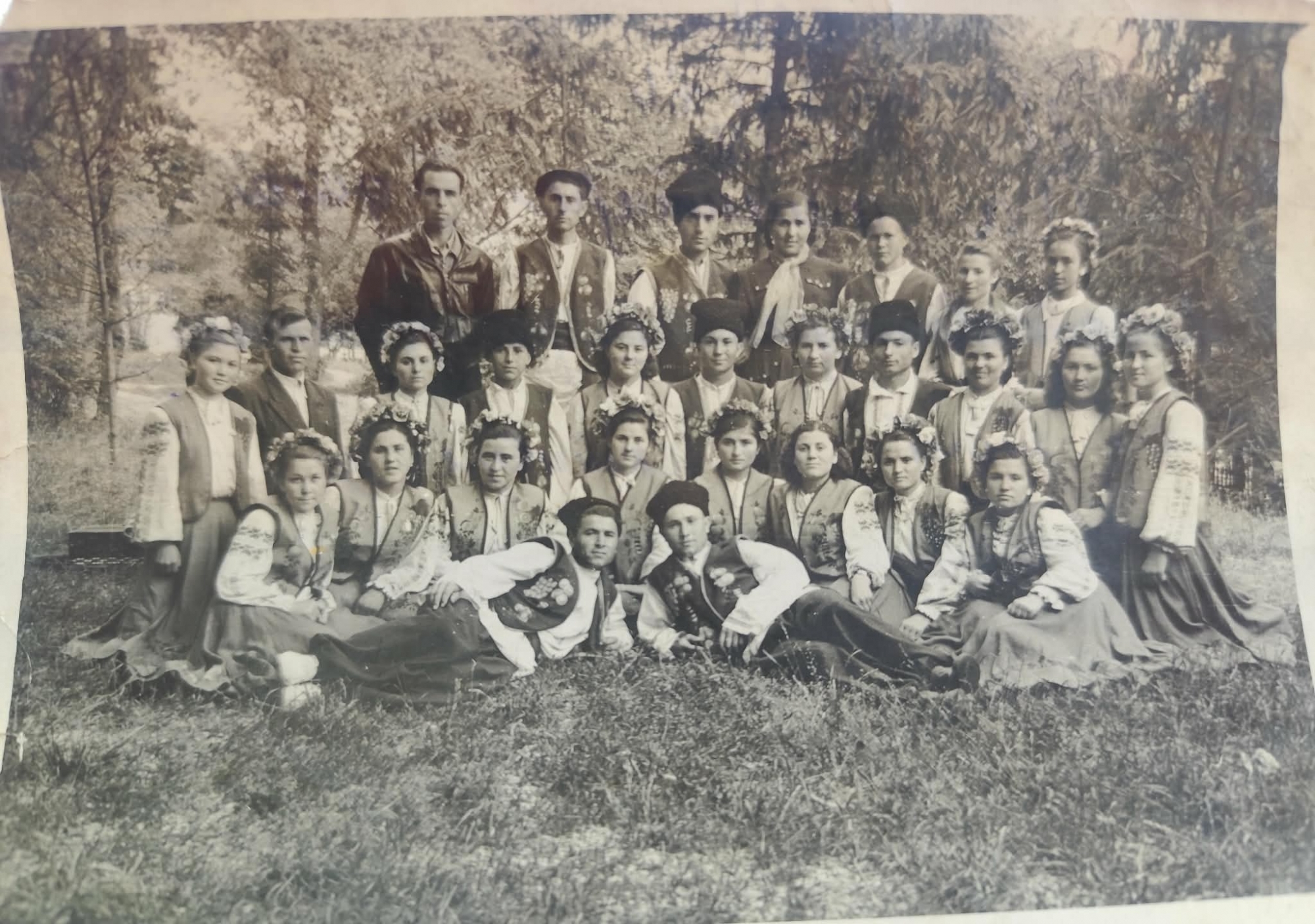 Fotografia alb negru prezintă colectivul de activitate artistică de aproximativ 25 de persoane, dispuse pe patru niveluri: unii stau întinși pe iarbă în față, alții în genunchi, un rând în picioare și un rând în spate, pe un mic dâmb. Costumele sunt bogat ornamentate și oferă indicii despre tradițiile zonei. Femeile poartă ii (cămăși) cu mâneci bufante, decorate cu broderii complexe pe umeri și de-a lungul mânecilor. Peste cămăși poartă veste (pieptare) închise la culoare, decorate cu motive florale și geometrice. Pe cap, majoritatea poartă cununi de flori mari, luminoase, indicînd astfel participarea la Festivalul Republican de folclor. Bărbații poartă cămăși albe de sărbătoare și veste similare cu cele ale femeilor. Elementul distinctiv este căciula de miel (cușma), purtată de unii tineri, în timp ce alții poartă șepci tip „caschetă” sau au capul descoperit. Grupul se află în aer liber, într-un parc sau la marginea unei păduri, cu arbori înalți și vegetație bogată în fundal.