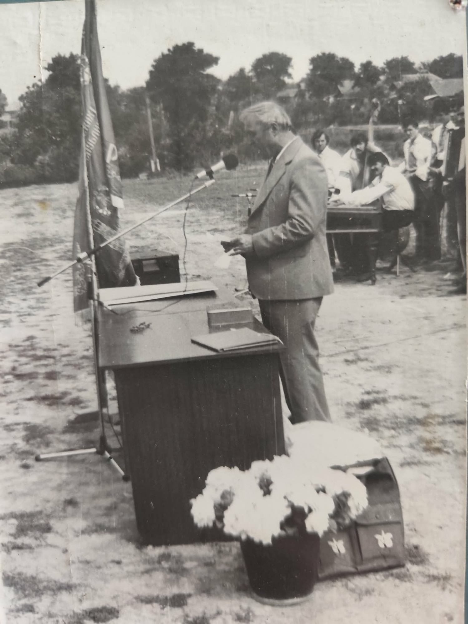 Fotografia alb negru surprinde un moment solemn, - petrecerea la pensie a unui grup de 13 persoane din satul Slobozia Mare. La microfon , cu părul grizonant, îmbrăcat într-un costum deschis la culoare, citind de pe o foaie la un pupitru improvizat este Ion Geantîc, președintele comitetului syndical. Postura sa indică autoritate și respect. În stânga se află un steag de dimensiuni mari, ușor drapat. În fața biroului se află o vază mare cu crizanteme albe simbolizând ocazia festivă. În plan secund, în partea dreaptă, se observă taraful musical al satului. Sărbătoarea are loc în aer liber, pe un terenul sportive al localității Slobozia Mare.