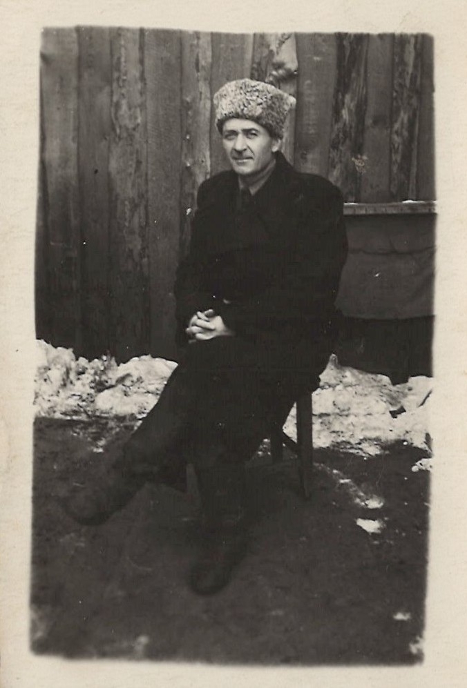 Este înfățișat pe fundalul unui perete/gard, în aer liber, plan de ansamblu, așezat pe scaun, picior peste picior, cu mâinile pe genunchi. Îmbrăcat în palton negru, cu căciulă de caracul pe cap. Lângă perete se vede puțină zăpadă. Pe reversul fotografiei se regăsește o inscripție olografă. Fotografia este realizată îndată ce-a fost eliberat înainte de termen din închisoare și venise la familia lui, care se mutaseră în or. Usolie-Sibirskoe, deportată în 1949 din s. Moara de Piatră, r. Bălți. În 1948 el a fost condamnat la 10 ani privațiune de libertate, fiind învinuit de colaboraționism.