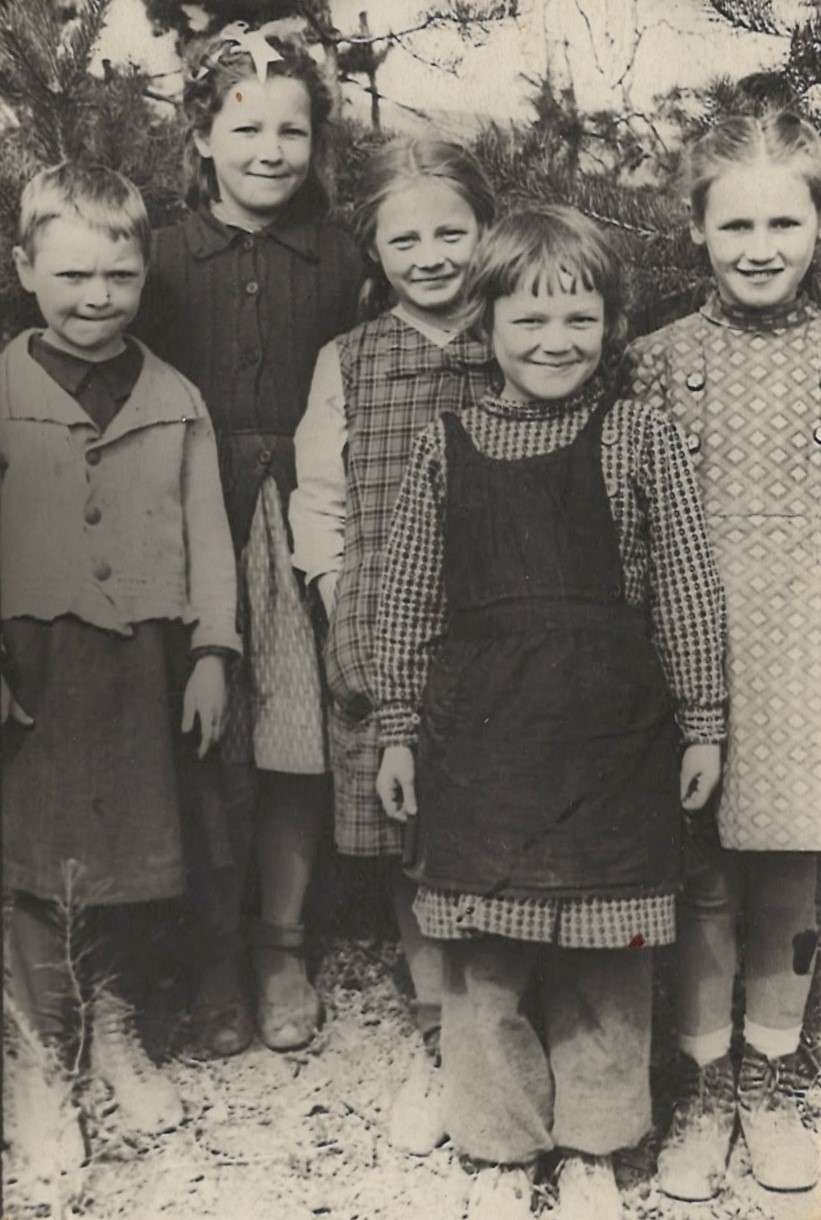 Un grup de cinci fetițe, eleve în clasa întâi a școlii din localitatea Kolobovshchino, sunt imortalizate în aer liber, pe fundalul unor copaci, plan de ansamblu. În primul rând, prima din dreapta - Olga Copacinschi, îmbrăcată într-o rochie în carouri, cu șorț negru, pantaloni largi. Încălțată în ghete cu șireturi, frizură scurtă. Olga a fost deportată împreună cu mama sa și cei trei frați în anul 1949 din s. Moara de Piatră, raionul Bălți (astăzi Drochia). Familia ei s-a aflat inițial în localitatea Kolobovshchino, mai apoi trec cu traiul în or. Usolie-Sibirskoe, regiunea Ircutsk. Tatăl ei, condamnat 1n 1948 pentru „colaboraționism”, și-a ispășit pedeapsa într-un lagăr din Siberia. Când se eliberează vine la familia lui. Se întorc la baștină în august 1957. Sunt reabilitați în anul 1992.