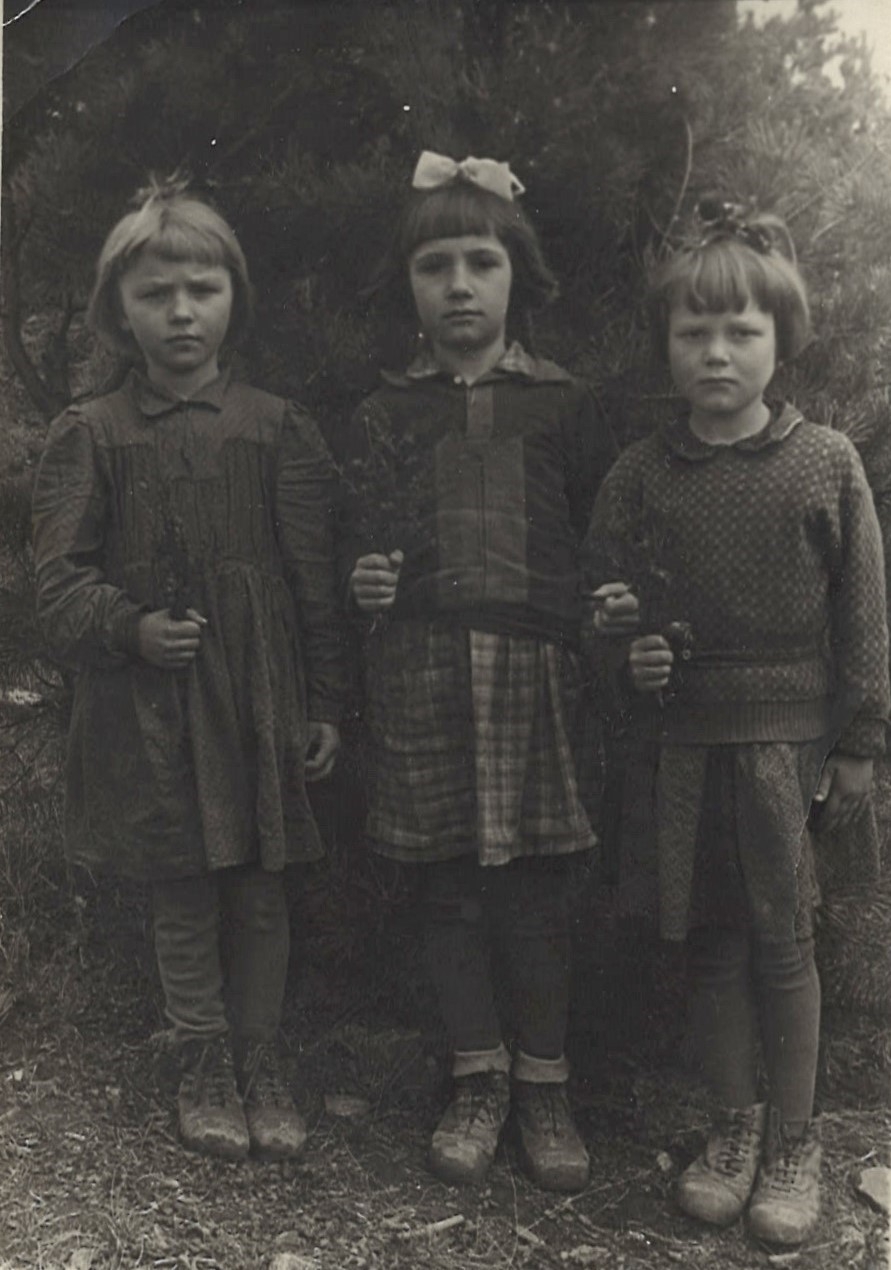 În imagine sunt reprezentate trei fetițe, pe fundalul unor copaci, plan ansamblu. Prima din dreapta -Olga Copacinschi, îmbrăcată în fustiță, pulover și colanți de culoare închisă, în picioare poartă ghetuțe cu șireturi; frizură scurtă, cu fundiță în păr. Toate fetițele țin în mână câte un buchețel de flori de câmp.