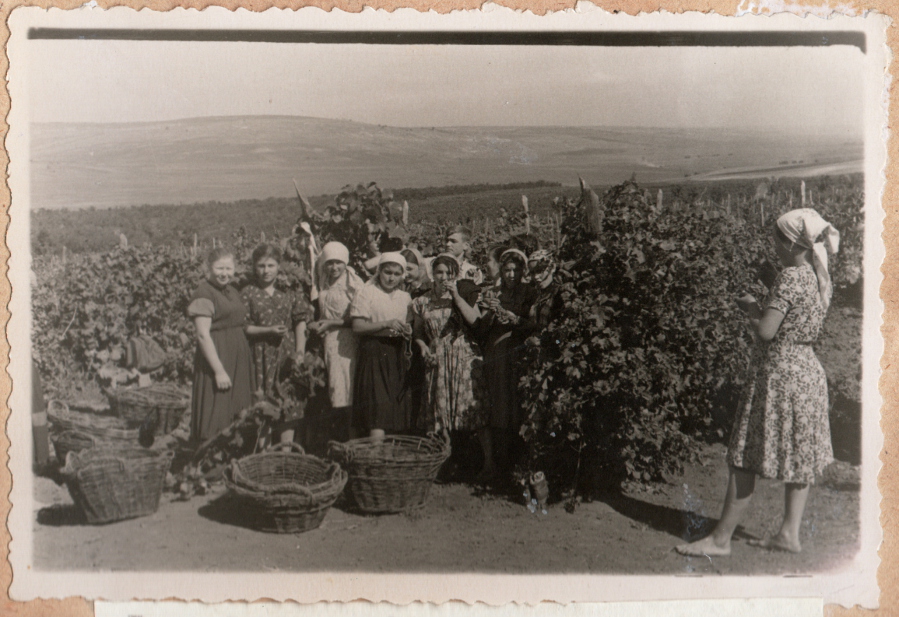 În imagine un grup de fete la vie, la cules struguri în sovhozul „Săseni”. Jos stau coșuri împletite goale, fetele în rochii cu print floral, cu batiste pe cap, unele cu picioarele goale(desculț).