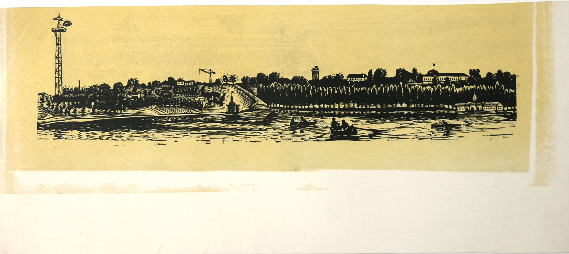 Peisaj panoramic. În prim plan - apele lacului; în dreapta - 3 bărci cu 5 luntraşi. În plan secund - mal cu coline; clădiri, arbori; stînga - o turlă pentru paraşută şi o macara; la centru - drum; dreapta - clădiri pe apă. Fundal - galben.