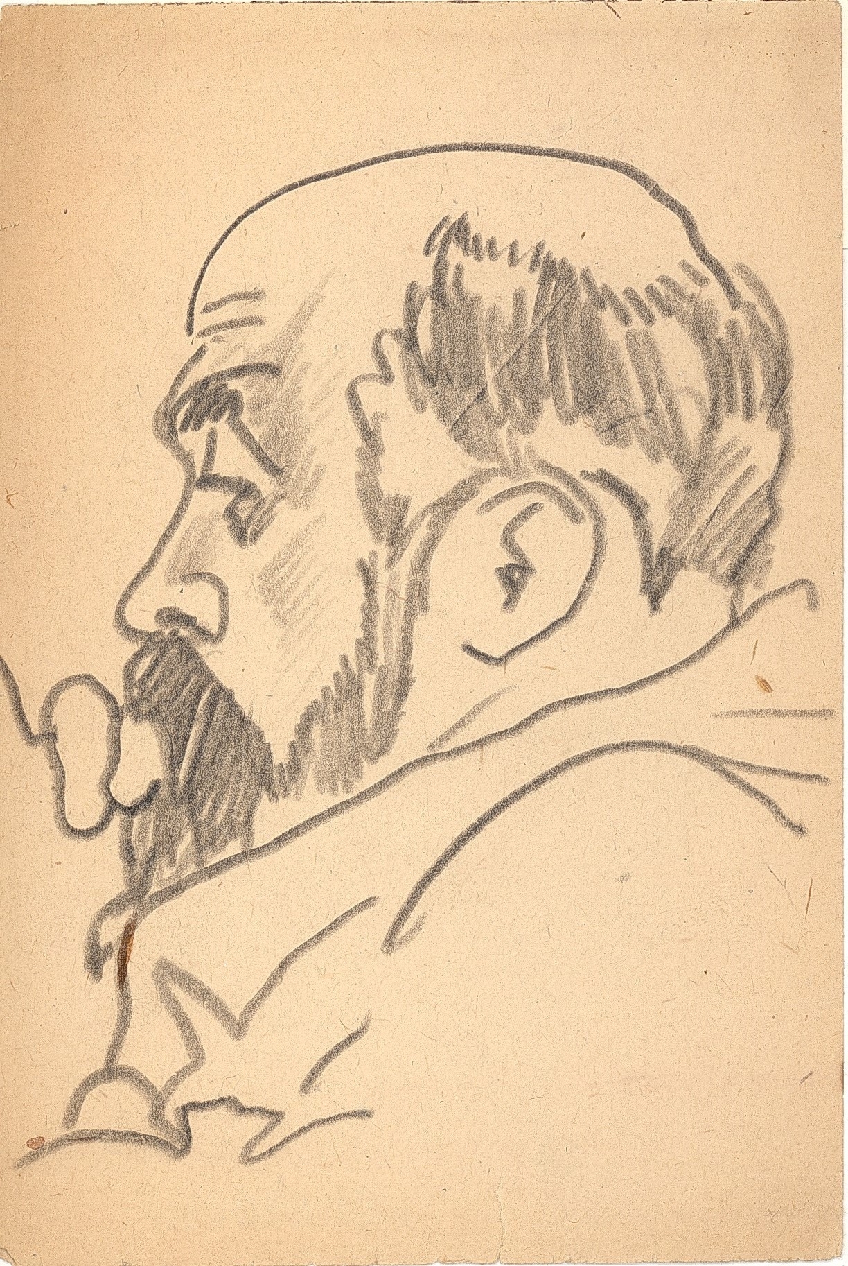 stg, cu chelire, barbă şi musteţi; mîinile încleştate la bărbie, poartă haină cu guler înalt.