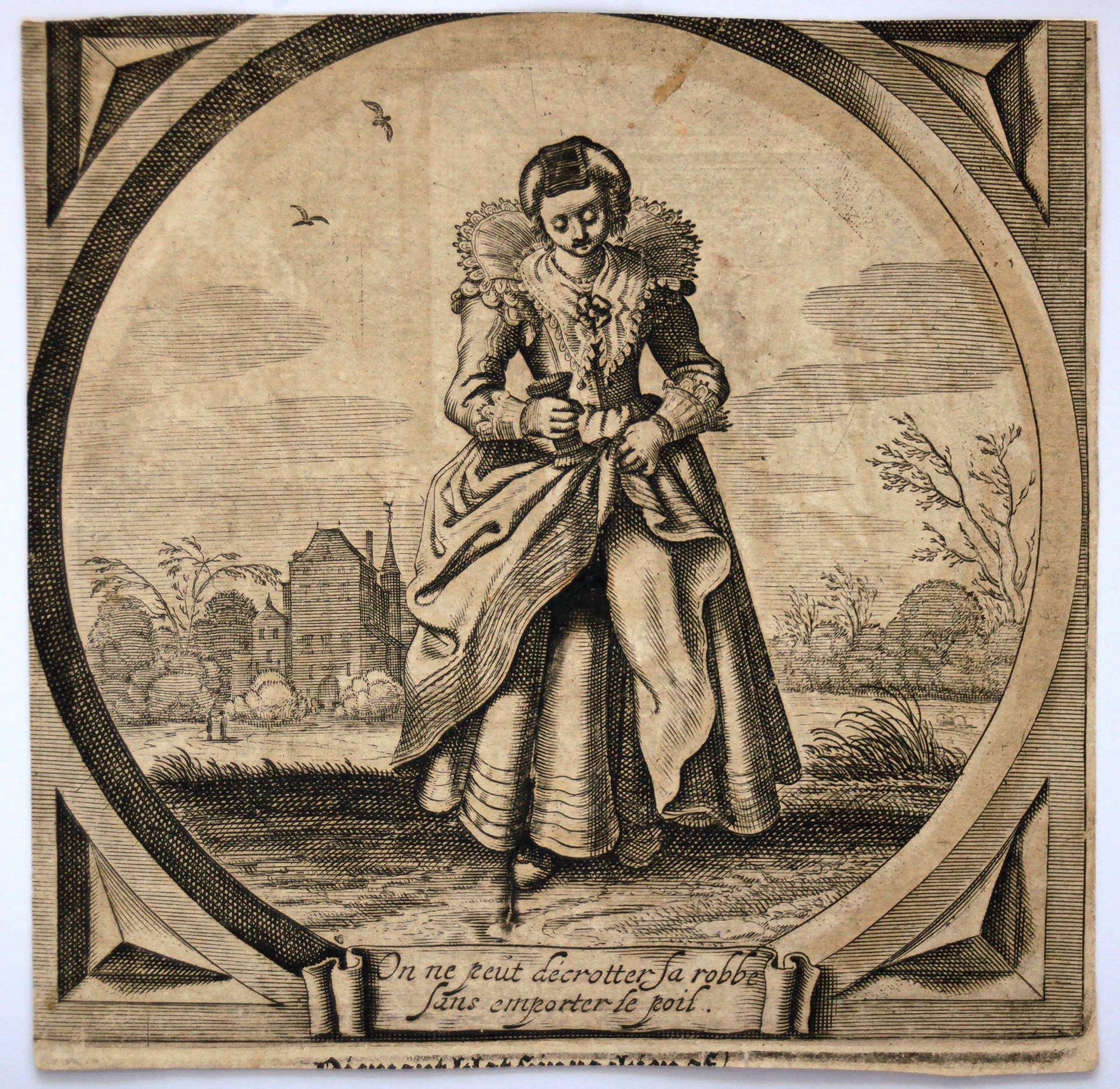 O femeie în plină statură cu capul aplecat ușor înainte. Poartă un costum fastuos, cu guler înalt bogat ornamentat. Pe cap cu un acoperământ specific epocii. Pe verso - o scenă de gen, 3 femei în diverse atitudini, una dintre ele , stapână o ceartă pe cea din stânga. Tot aici - un câine manânca continutul dintr-un vas răsturnat.